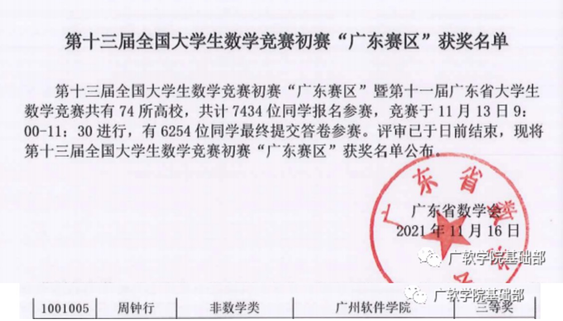11月13日,第十三届全国大学生数学竞赛初赛“广东赛区”暨第十一届广东省大学生数学竞赛以线上赛事的形式开赛,省内74所高校共计7434名学生报名参赛。11月16日,赛事主办方公布获奖名单,我校软件工程系周钟行同学(指导老师:田检、叶锋)获得广东赛区(非数学类)三等奖,实现了广州软件学院学生在数学国赛上零的突破。