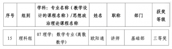 近日,学校下发文件,公布2022 年学校青年教师教学大赛获奖名单,基础部教师欧阳通主讲的《离散数学》获讲师组三等奖,并获得省级复赛资格。