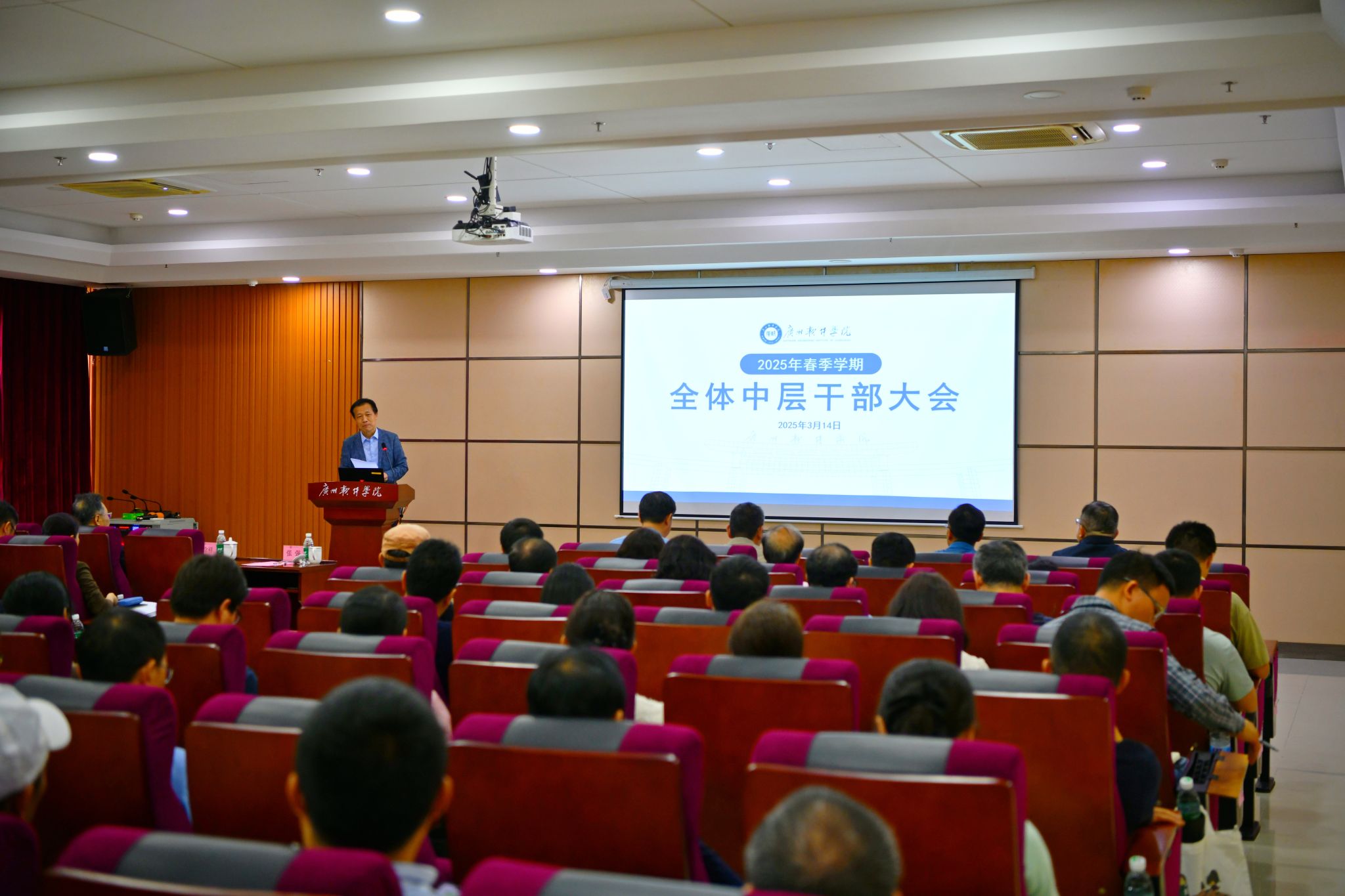 本网讯 3月14日下午,我校在国际报告厅召开2025年春季学期中层干部大会。校长张强、党委书记兼督导专员刘友坤、副校长徐祥、副校长袁志、副校长曹广福、党委副书记兼纪委书记张广金、校长助理张屹以及全体中层干部、助理参加会议。会议由校长张强主持。