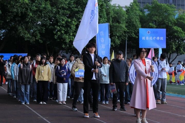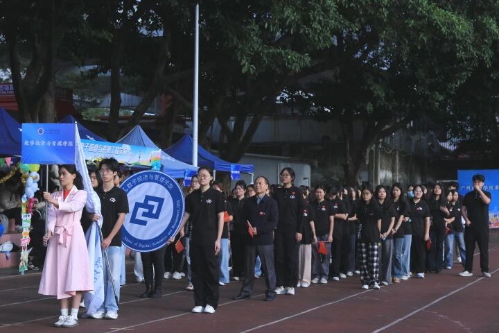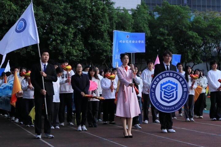 步伐铿锵、气宇轩昂的国旗方阵庄严入场,熠熠生辉的五星红旗引领方向,彰显着新时代广软师生对祖国的热爱与敬意。紧随其后,校旗与校徽方阵荣耀登场,飘扬的旗帜与闪耀的徽章承载着“明德日新 知行合一”的广软精神,激励着广软学子将个人理想融入时代洪流,以强健体魄和昂扬斗志为民族复兴贡献青春力量。