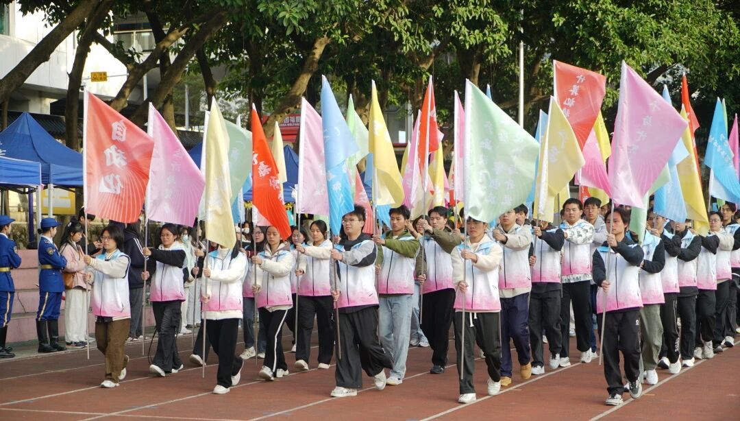 彩旗方队手握各色旗帜,心却向一处汇聚。飘扬的旗帜带着青春舞动的气息,为这激动人心的赛事锦上添花,充满生气。这缤纷色彩既是运动会绚丽篇章的开启,更象征着我校体育项目成绩如全运盛会般百花齐放、生机勃勃。
