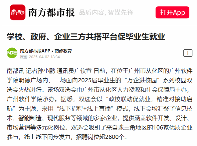 【南方都市报】学校、政府、企业三方共搭平台促毕业生就业(2025年4月2日)