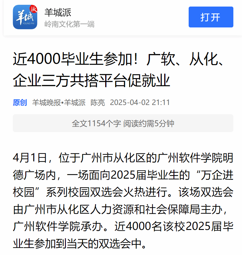 【羊城晚报•羊城派】近4000毕业生参加!广软、从化、企业三方共搭平台促就业(2025年4月2日)