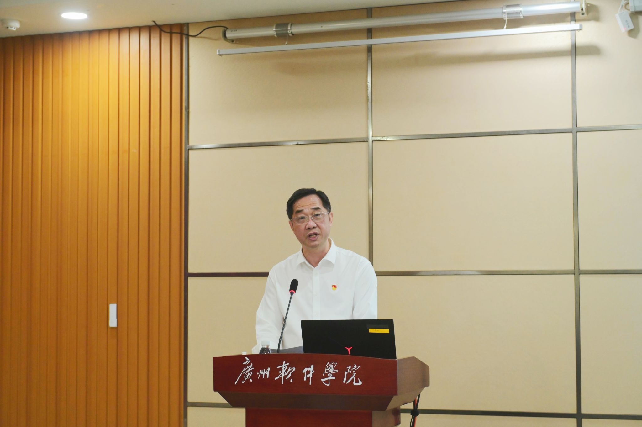 本网讯 5月8日上午,广州软件学院深入贯彻中央八项规定精神学习教育读书班暨党委理论学习中心组(扩大)学习会在国际报告厅举行。读书班第一场专题讲座由暨南大学马克思主义学院原创始院长、中华民族凝聚力研究院院长、博士生导师程京武教授主讲。全体校领导、学校党委委员、纪委委员、各二级学院院长、党委书记、行政教辅单位正职、直属党支部书记参加学习。学校党委书记兼督导专员刘友坤主持学习会。