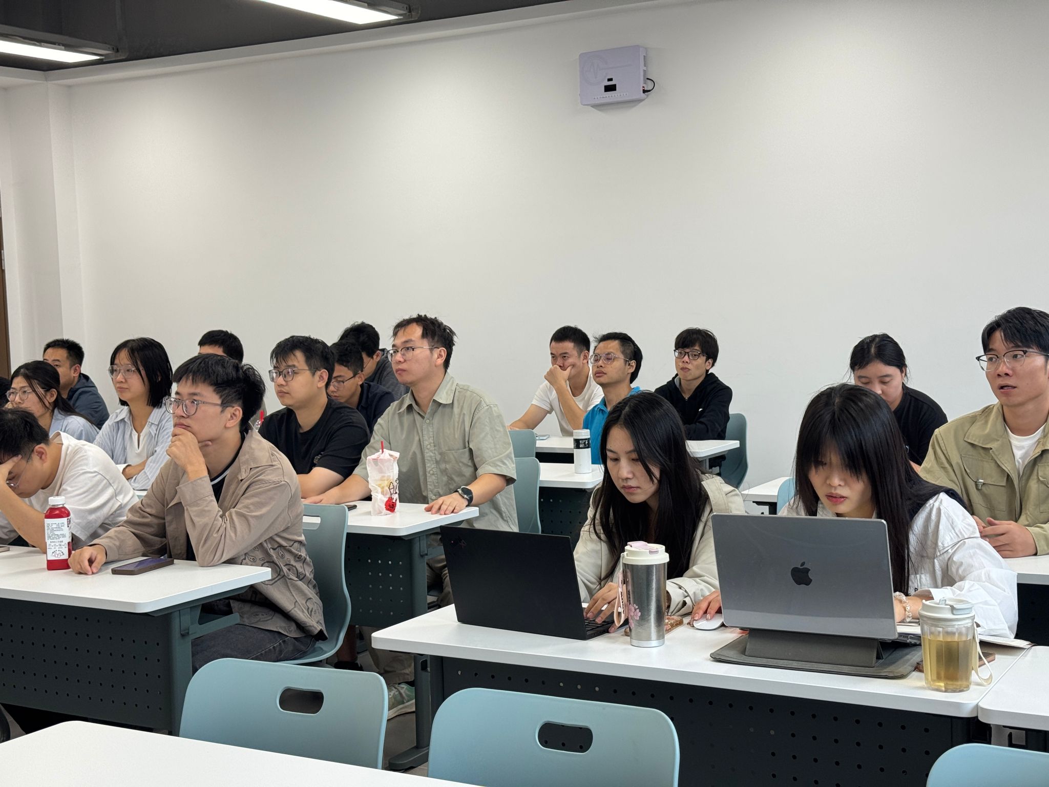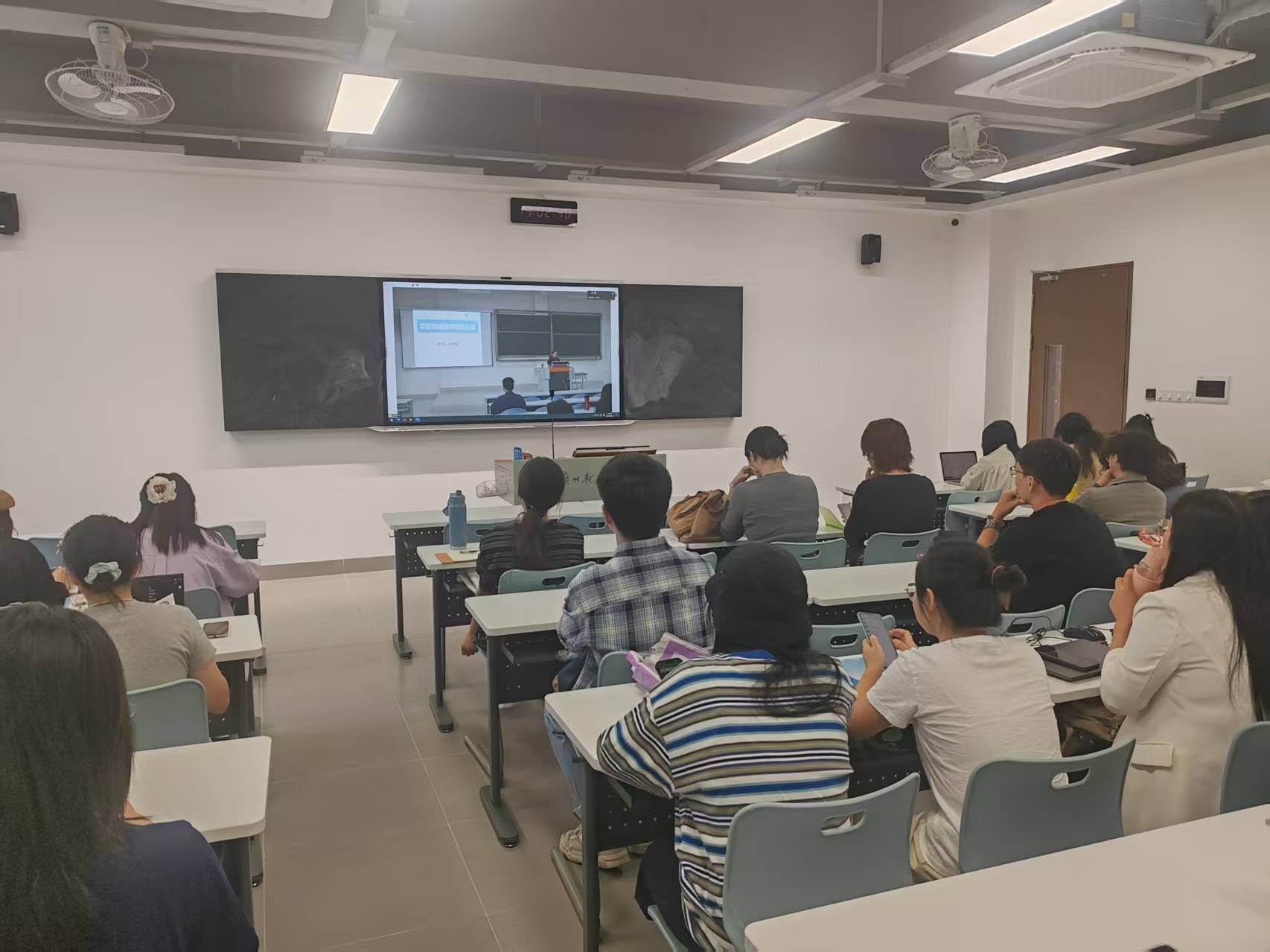 本次培训采用“线下主会场+线上集中分会场”形式,广州校区教师在笃行楼T201、T301教室参与线下培训,江门校区教师则在荟贤楼H3-505、H3-506教室通过腾讯会议参与线上集中学习,教务与教学保障部全程保障线上直播稳定。培训现场,教师们认真记录要点,围绕“如何设计开放性实验任务”“如何应对学生实操中的突发问题”等话题展开热烈讨论,学习氛围浓厚。