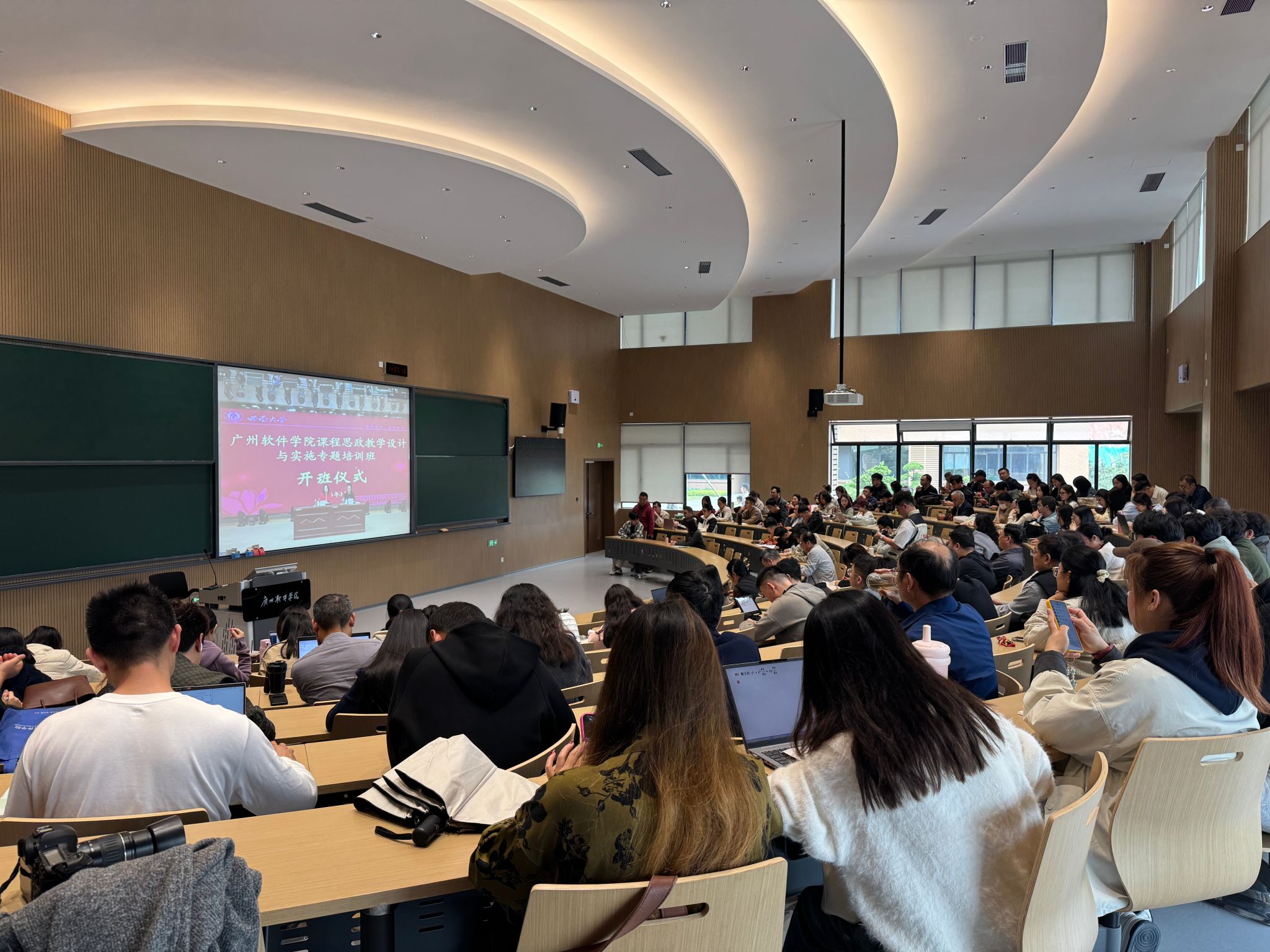 为深入推进课程思政建设,推动思政教育与专业教学深度融合,切实提升教师课程思政教学设计与实施能力,2026年3月5日至7日,广州软件学院携手西南大学开展课程思政教学设计与实施专题培训。本次培训广州、江门双校区同步联动,通过“线下授课+线上直播”的形式为教师搭建学习交流与能力提升的专业平台,江门校区全体专任教师积极参与,现场学习氛围浓厚。
