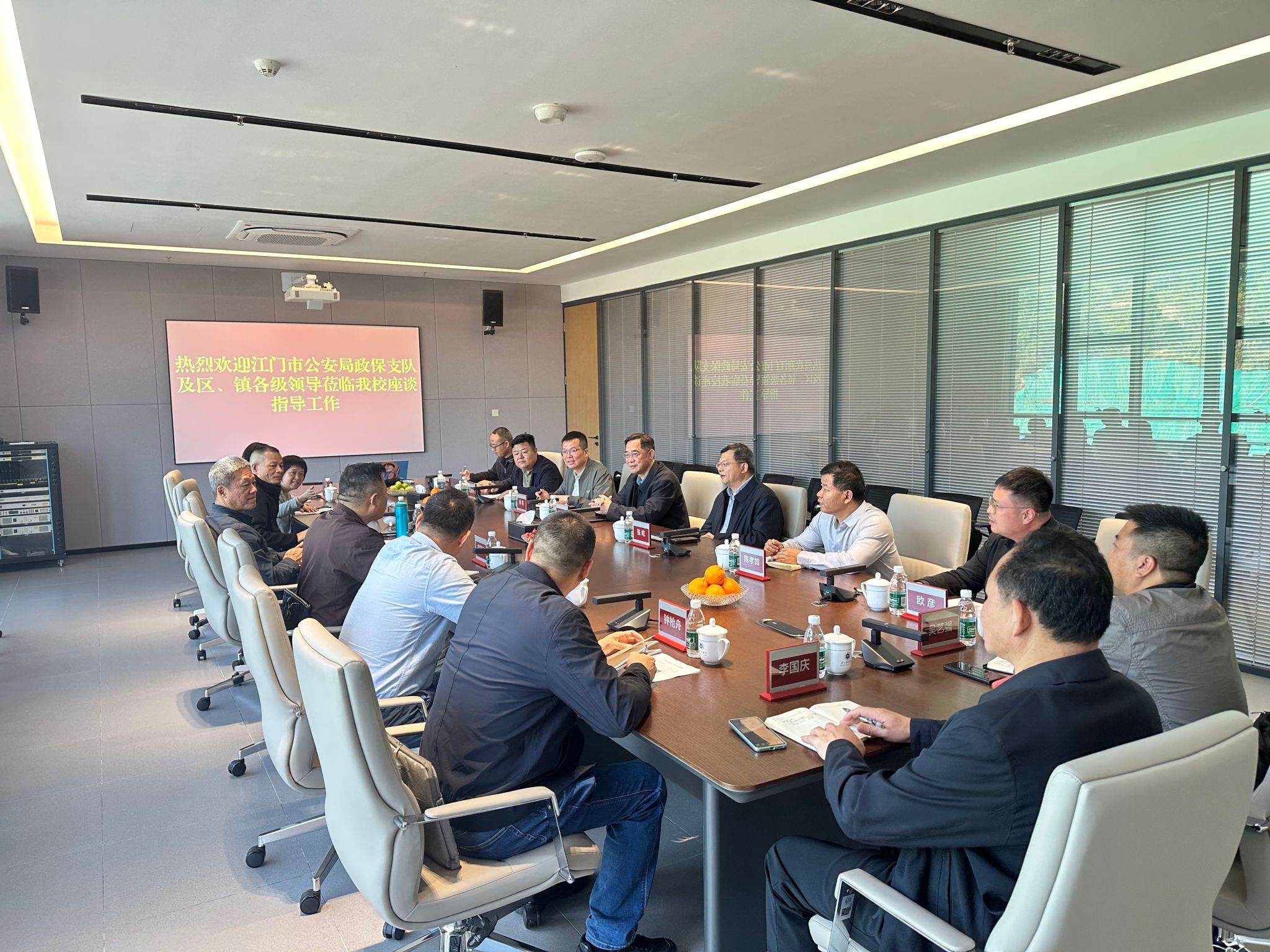 江门市相关领导及职能部门负责人认真听取了校区情况介绍,并结合属地管理实际,就校地信息互通、联防联控机制建设、周边环境综合治理及突发事件应急处置等具体工作提出了专业意见与建议。双方一致认为,要建立健全常态化沟通协调机制,做到信息共享、风险共研、处置联动,形成维护政治安全的强大合力。