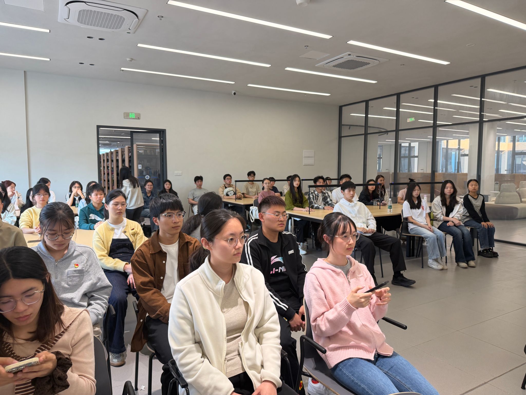 仪式核心环节,党员教师与结对学生现场面对面交流、互留联系方式、建立线上沟通群组,从“线上好友”变为亦师亦友的共读伙伴,为后续常态化共读交流筑牢坚实基础。启动仪式圆满落幕后,图书馆馆员随即分组带领结对师生前往书架区域,大家在馆员的专业指引下,结合自身专业学习需求与阅读兴趣自由选书,亲手挑选心仪读物,让墨香正式开启这段专属的师生共读时光。