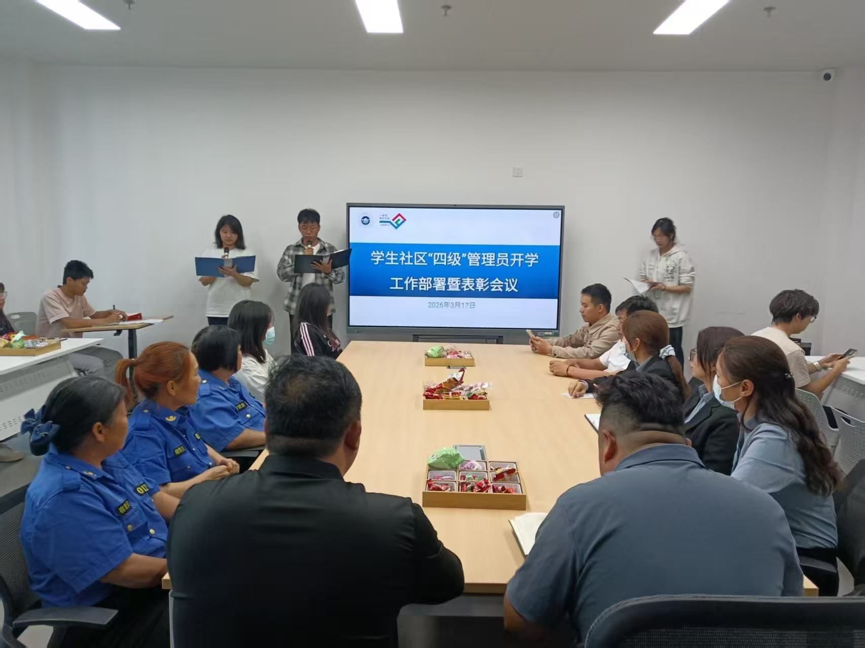 在安全管理方面,会议明确将重点强化高空抛物防范、违规电器排查及意识形态安全巡查,从严从细落实各项安全管控措施,全方位筑牢校园安全稳定防线;在文化建设方面,将有序推进宿管育人故事分享、学生社区空间文化升级等活动,丰富社区文化内涵,增强学生的社区归属感与认同感;在物业服务方面,相关负责人提出将推出集中晒被、月度便民服务日等暖心举措,精准对接学生需求,切实提升学生生活服务体验。