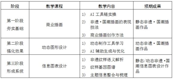 《人工智能赋能广东非遗动态传播的民办高校视觉课程链重构研究》:本课题的总体框架为《商业插画→动态图形设计→信息图表设计》的递进式课程链。通过三个阶段的学习与实践,将非遗文化与AI技术深度融合,推动民办高校视觉传达专业课程体系的创新与发展(见表2)