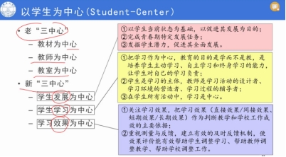 他强调,课程建设与教学实施必须突出“以学生为中心”的课程建设核心理念,即以学生为中心的教育理念、以产出为导向的教育体系、持续改进的质量保障体系。因此教学改革必须从以“教材、教师、教室”老三中心转变为以“学生发展、学生学习、学校效果”新三中心,采取积极学习策略和课堂活动设计。