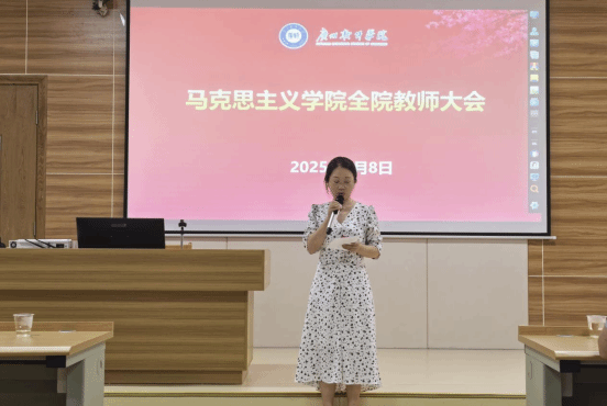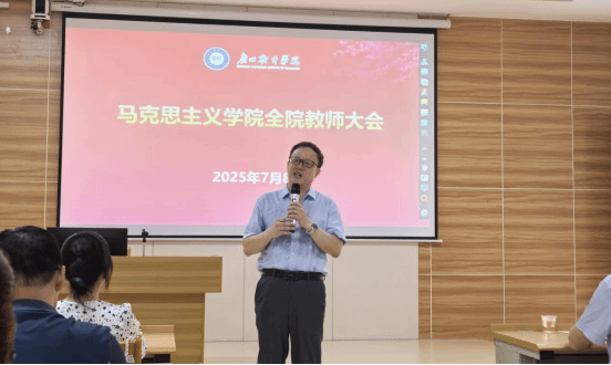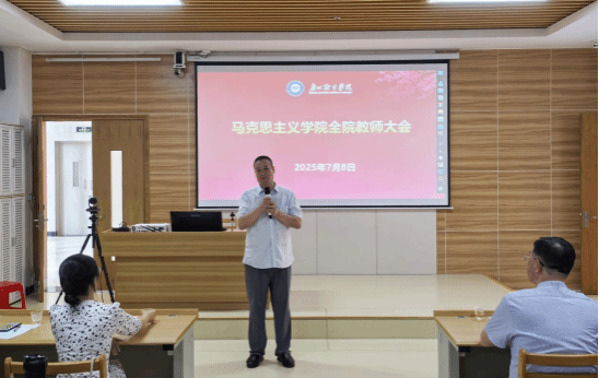 2025 年 7 月 8 日上午,马克思主义学院在图书馆 310 召开全院教师大会,宣布学校党委关于学院领导班子有关同志任职的相关决定并对期末及下学期工作进行部署。学校党委刘友坤书记、党委办公室马波主任出席会议,马克思主义学院丁邦友院长主持会议。