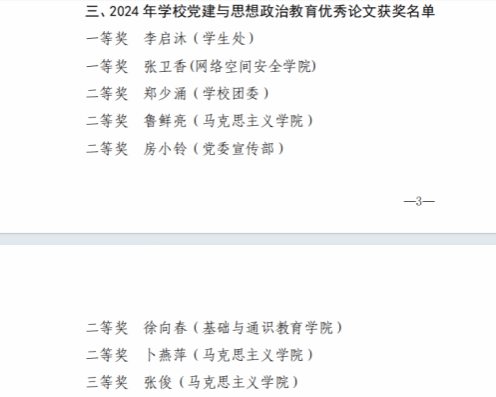鲁鲜亮老师、卜燕萍老师、张俊老师在“2024 年学校党建与思想政治教育优秀论文”的评选中分别获得二等奖、二等奖、三等奖的好成绩。
