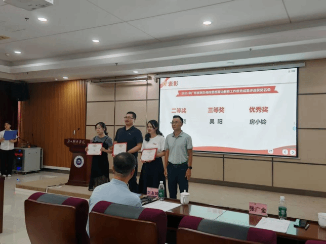 在微党课比赛结束后,活动还表彰了近期获奖的老师,来自马克思主义学院的王淑晓老师、吴阳老师、马波老师,在“2025年广东省民办高校思想政治教育工作优秀成果评选”中分别获得了二等奖、三等奖、优秀奖的好成绩。