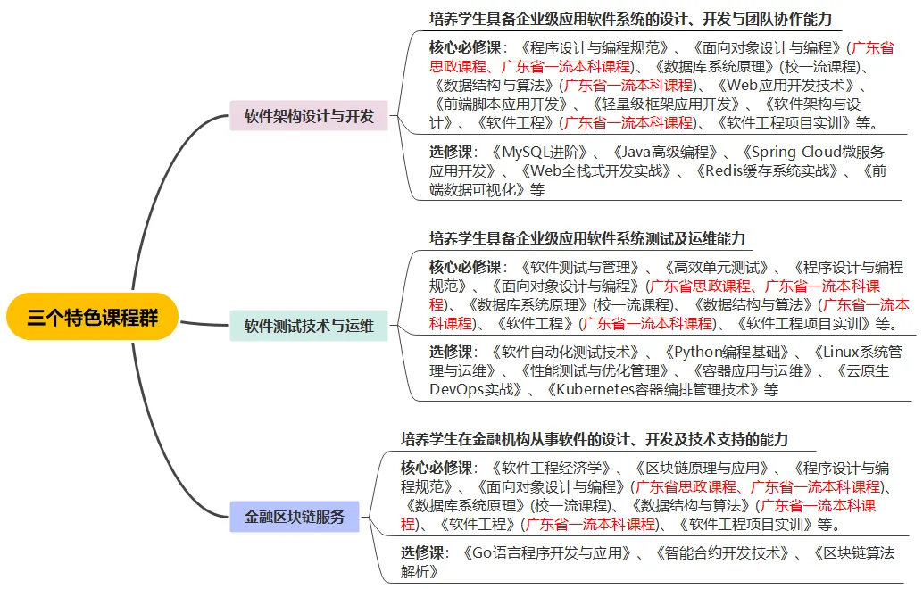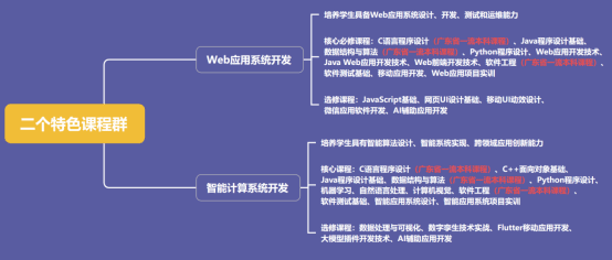 (1)围绕岗位需求,构建两大特色培养方向:针对软件开发工程师、软件测试工程师、系统运维工程师及人工智能工程师等岗位需求,设置"Web应用系统开发"和"智能计算系统开发"两大特色课程群。通过系统化的课程体系,培养具备团队协作精神和创新意识,掌握计算机科学与技术学科基础理论和专业技能,具有计算思维能力、系统设计与实现能力以及较强工程实践能力的复合型人才。