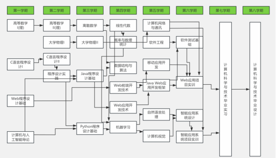计算机组成原理、计算机通信与网络、操作系统、Java程序设计基础、数据库系统原理、数据结构与算法、Web应用技术开发、Java Web应用开发框架、软件工程、Python程序设计、数据处理与可视化、机器学习、自然语言处理、计算机视觉。