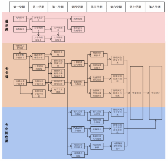 开设的专业基础课和专业核心课:物联网工程导论、高等数学、C语言程程序设计、电路与电子技术、离散数学、电路与电子技术实验、大学物理、计算机系统组成、单片机原理与应用、电子工艺制作、数据结构与算法、线性代数、概率论与数理统计、计算机网络、操作系统原理与应用、数据库系统、物联网通信技术、物联网控制技术、传感器原理与应用、射频识别原理应用、物联网信息安全技术、物联网工程设计与实现、物联网工程毕业实习、物联网工程毕业设计等课程。专业特色课程(1)智能硬件开发:嵌入式系统基础、物联网操作系统、嵌入式驱动开发、物联网网关开发技术;(2)智能信息服务:Python程序设计、机器学习、数据处理与可视化、图像识别与自然语言处理实践;(3)鸿蒙系统应用开发:鸿蒙操作系统、鸿蒙应用开发技术、鸿蒙系统移植、鸿蒙智能硬件开发技术等课程。在国标规定的专业基础课和专业核心课基础上,在智能网关开发、智能信息服务、鸿蒙系统应用开发等方向建设了特色应用型课程群。