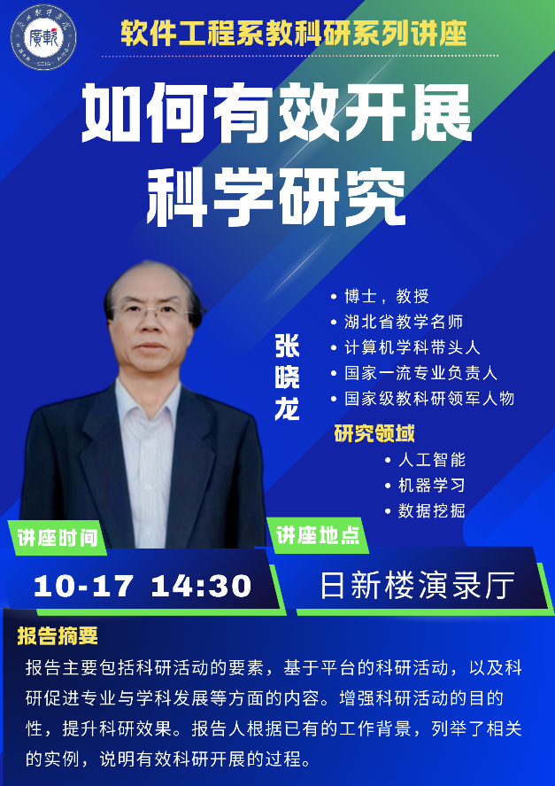 为进一步提升软件工程系教师的科研能力和水平,2024年10月17日下午14:30,我系学术带头人张晓龙教授,在日新楼演录厅举办了一场主题为“如何有效开展科学研究”的科研讲座。全系教师参加了本次讲座。