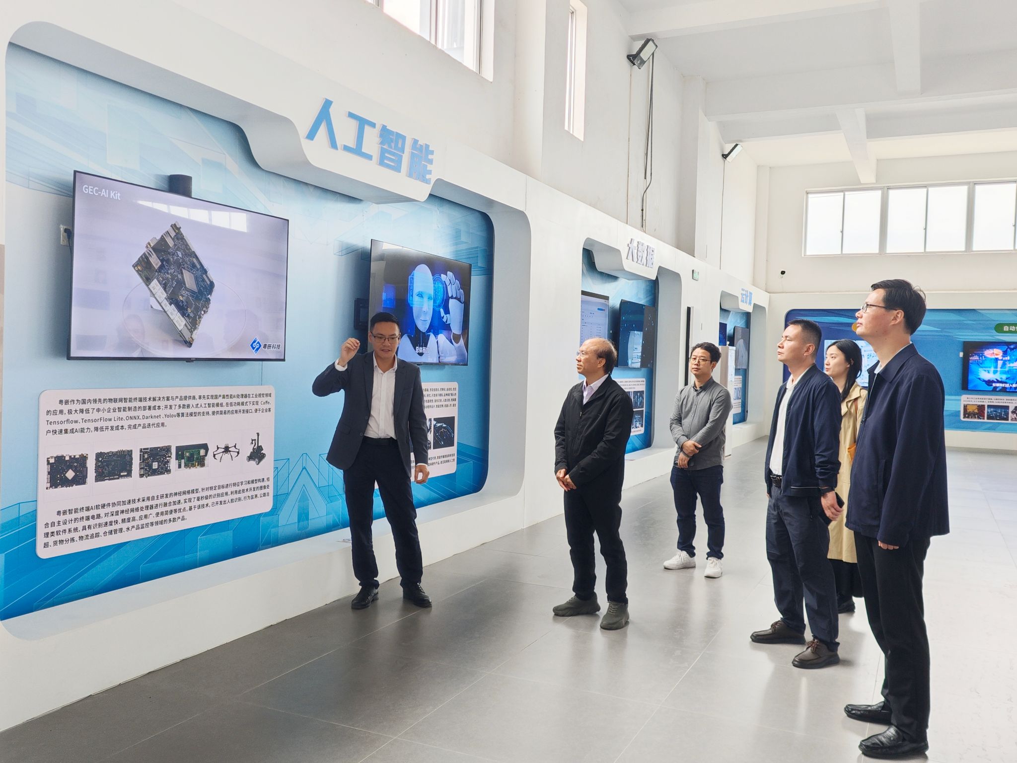 在走访过程中,学院领导先后参观了粤嵌培训基地,观摩了人才孵化成果展示,详细了解了企业在人工智能、软件工程等领域的先进培训模式。粤嵌公司总经理邓人铭介绍了公司以项目驱动为核心的实践教学体系,强调通过真实项目案例提升学生的实践动手能力和创新思维,这也是时代对人才培养的要求。