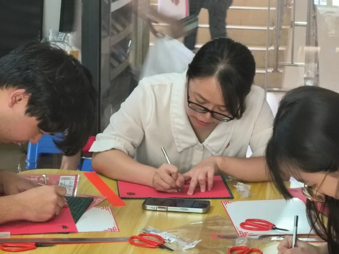 随着陈老师话语落下,剪纸活动正式拉开帷幕。同学们和老师们纷纷拿起刻刀、剪刀与彩纸,全神贯注投入创作。大家围绕红色主题,有的精心勾勒革命先辈的英姿,还有的展现红色历史场景。创作过程中,大家相互交流技巧、分享灵感,现场气氛热烈且温馨。经过大家一番精心雕琢,最终创作出一幅幅饱含情感的剪纸作品。