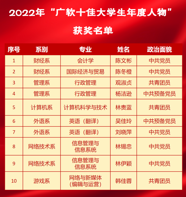 2023年3月31日,广州软件学院2022年“广软十佳大学生年度人物”评比会落下帷幕。经学校公示发文,陈文彬、陈冬橙、观淑贞、杨洁逊、林贵蓝、吴佳玲、刘晓萍、林锡忠、林伊颖、韩佳蓉等10名同学荣获2022年“广软十佳大学生年度人物”称号。