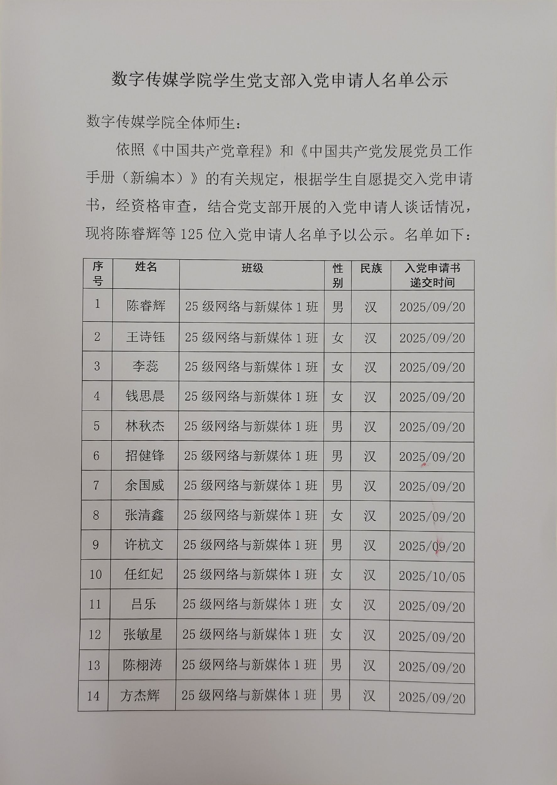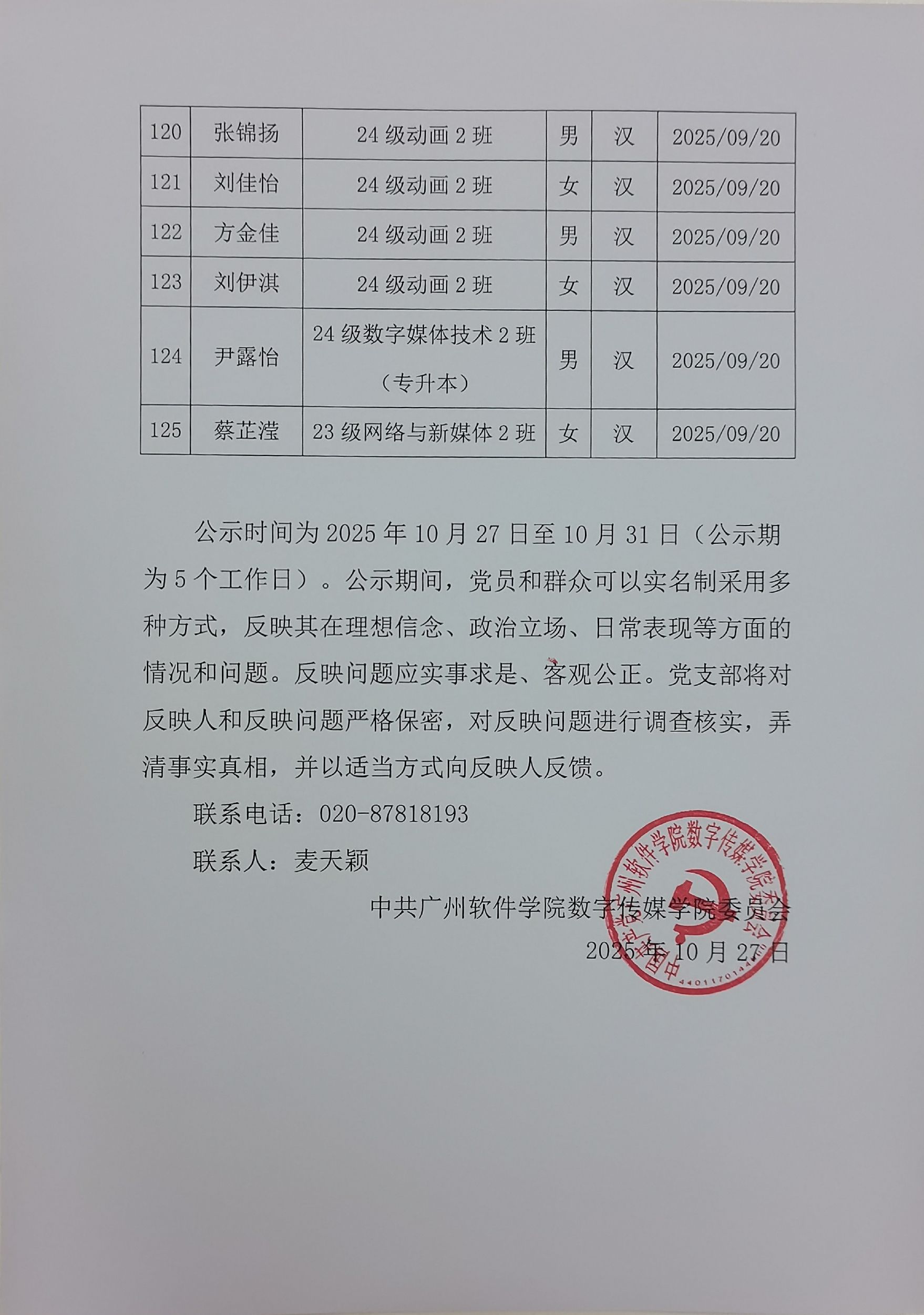 2025年下半年数字传媒学院学生党支部发展党员公示
