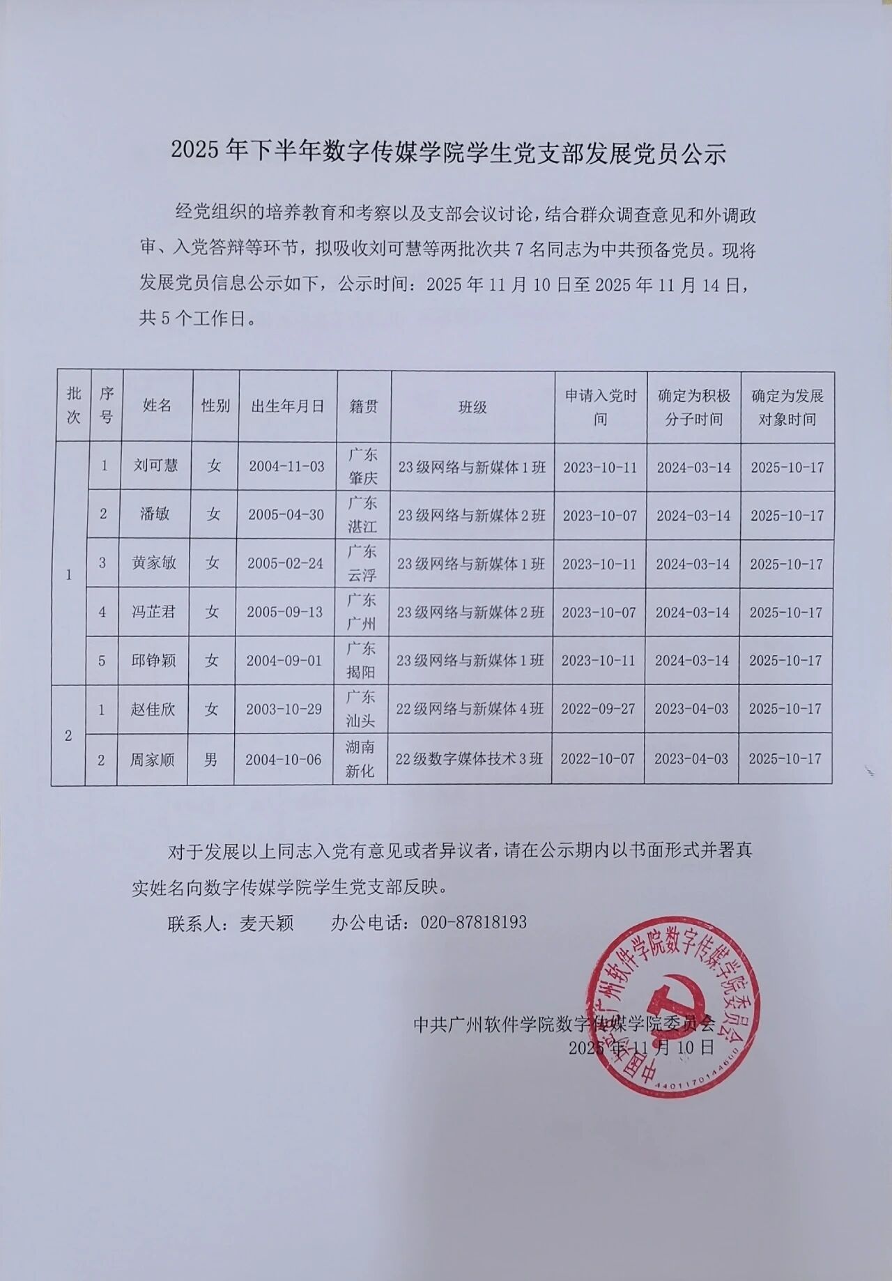 2025年下半年数字传媒学院学生党支部发展党员公示