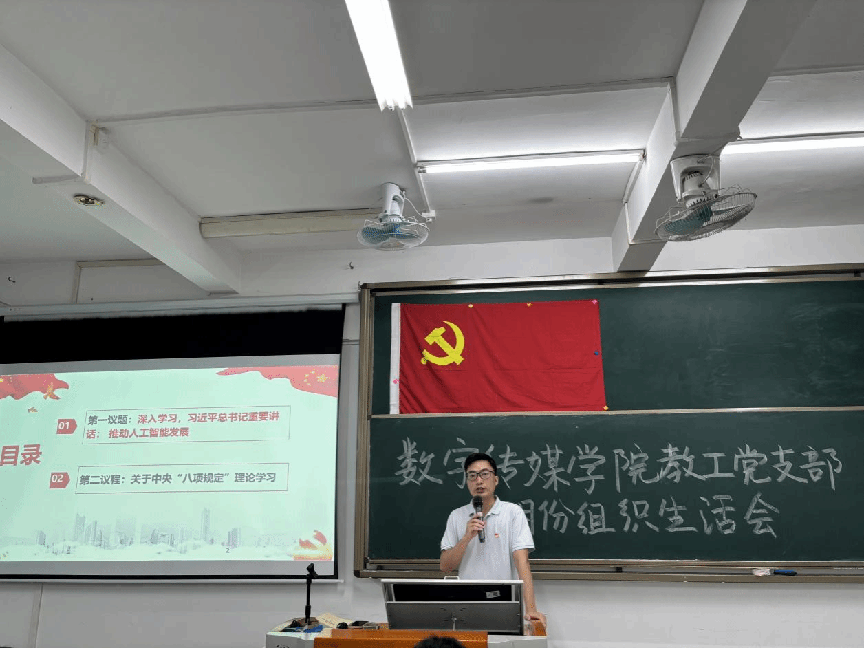 5月20日,数字传媒学院教工党支部召开5月份组织生活会,深入学习,习近平总书记重要讲话: 推动人工智能发展,学习关于中央八项规定精神。会议由数字传媒学院教工党支部组织委员方惠豹同志主持。