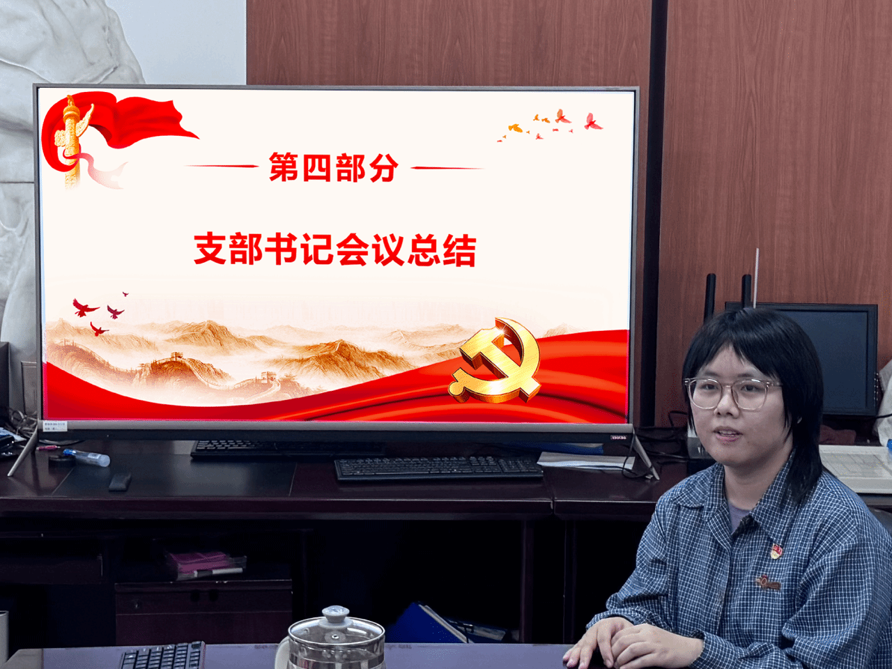 党支部书记麦天颖老师作总结讲话,她首先代表支部委员会向全体党员致以节日的问候,并向同志们提出要求:一是持续深化理论武装。认真学习党的路线方针政策,深刻领会党的创新理论,不断提高政治素养;二是时刻牢记党员身份。在学习、工作和生活中,自觉发挥先锋模范作用,在学业发展、学风建设、服务同学等方面率先垂范;三是不断加强党性修养。严守党的纪律,锤炼优良作风,勇于担当作为。