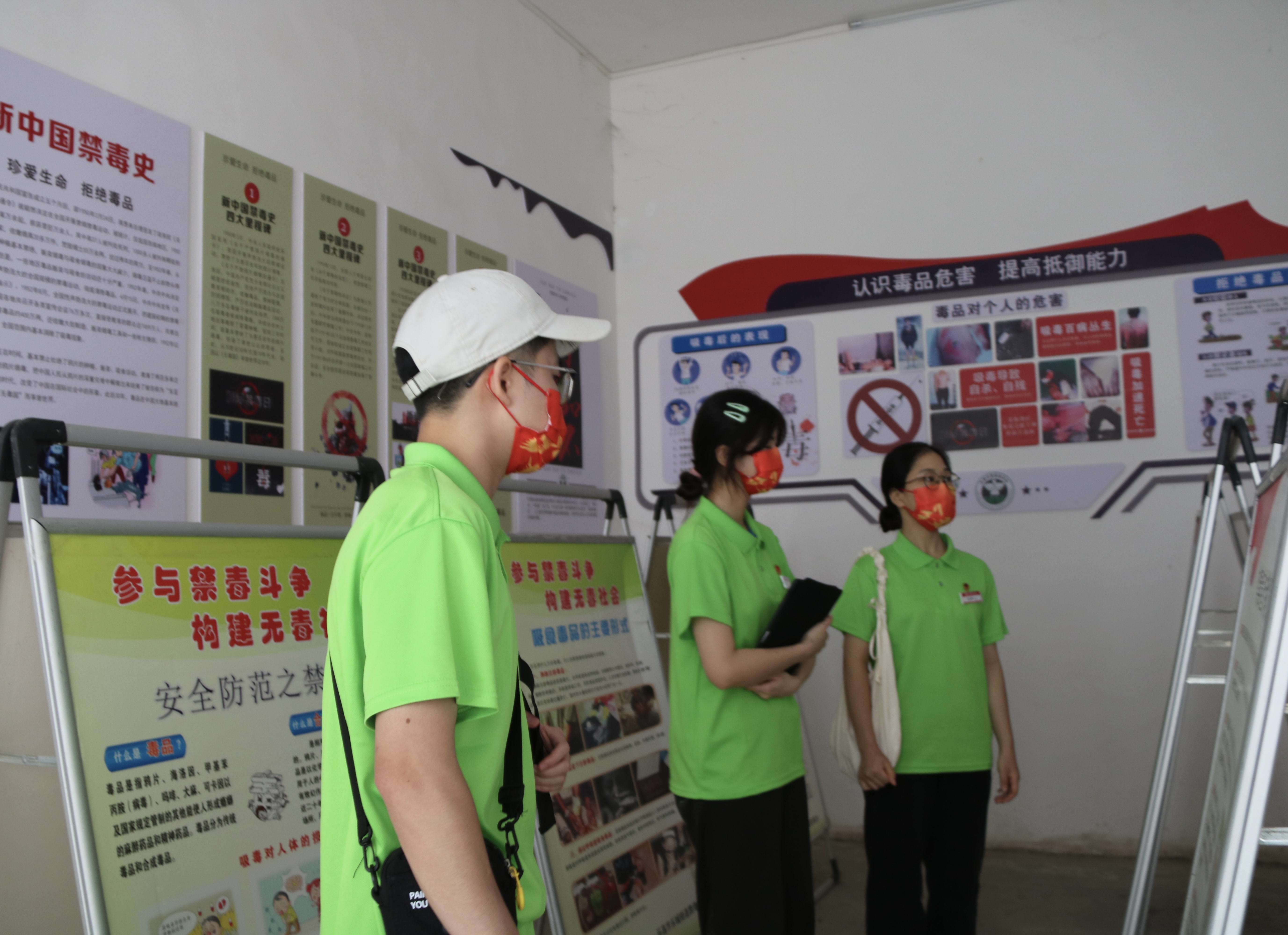 与此同时,心心相印组的四位组员来到了乐昌市禁毒办,由吴队长带领组员参观了戒毒工作所的设施和禁毒宣传展览,他详细地介绍了当地的禁毒、戒毒情况,为小组的禁毒调研提供了很大的帮助。