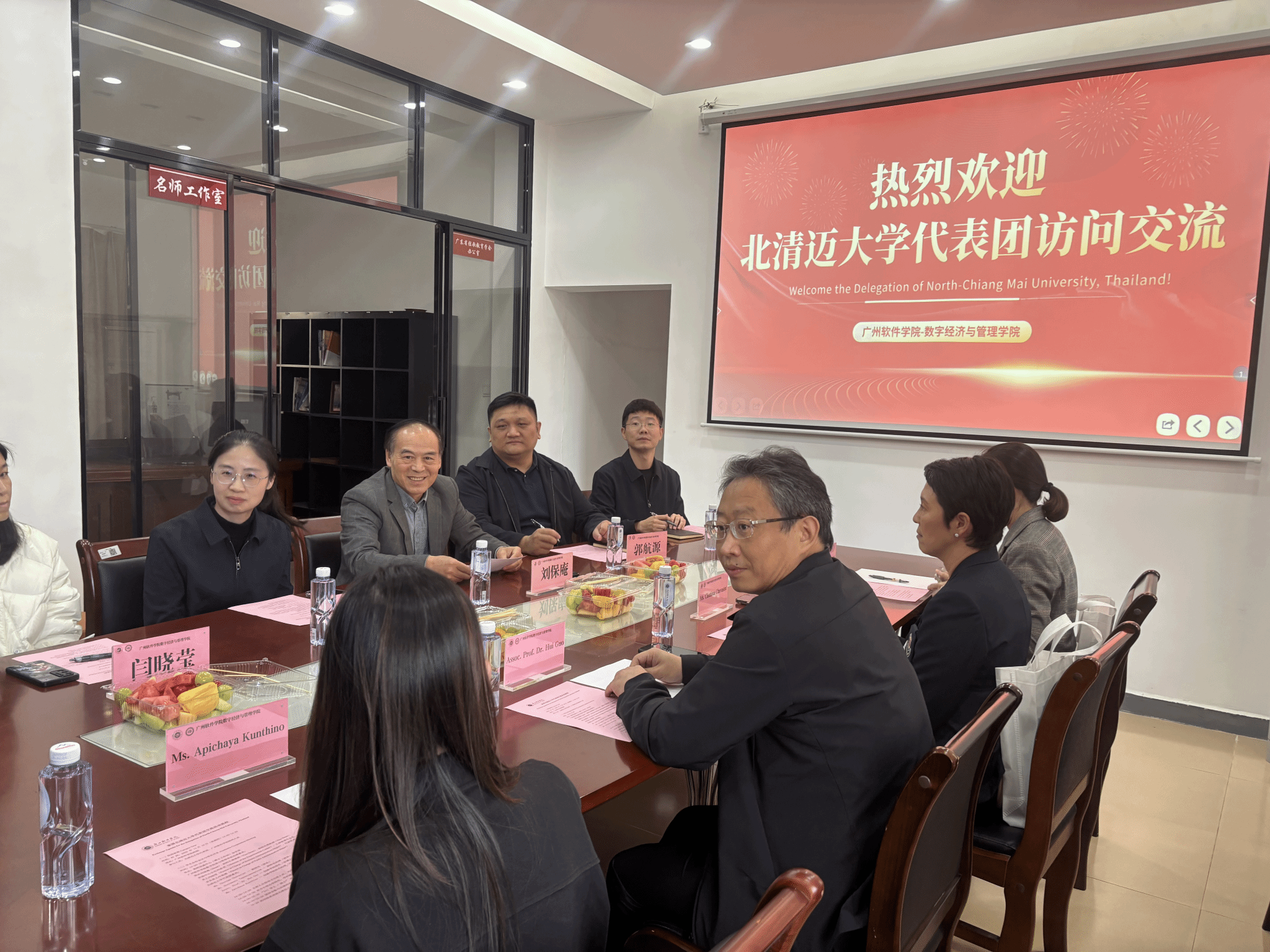为加强国际教育交流合作,搭建跨境校际合作桥梁,2025 年 11 月 10 日,泰国北清迈大学(North Chiang-Mai University)代表团在副校长 Ms. Chutima Chavasint带领下到访广州软件学院,双方围绕学术交流、学科建设及联合培养项目等议题开展深度座谈。广州软件学院数字经济与管理学院院长刘保庵、副院长唐顺莉、郭航源,实验中心主任刘彦君,工商管理专业负责人闫晓莹、行政管理专业负责人叶海燕等陪同交流;北清迈大学创新学院院长 Assoc. Prof. Dr. Hui Guo、副校长助理 Ms. Norrawatt Tanantaweepirom、创新学院院长助理 Ms. Apichaya Kunthino 等代表团成员出席。
