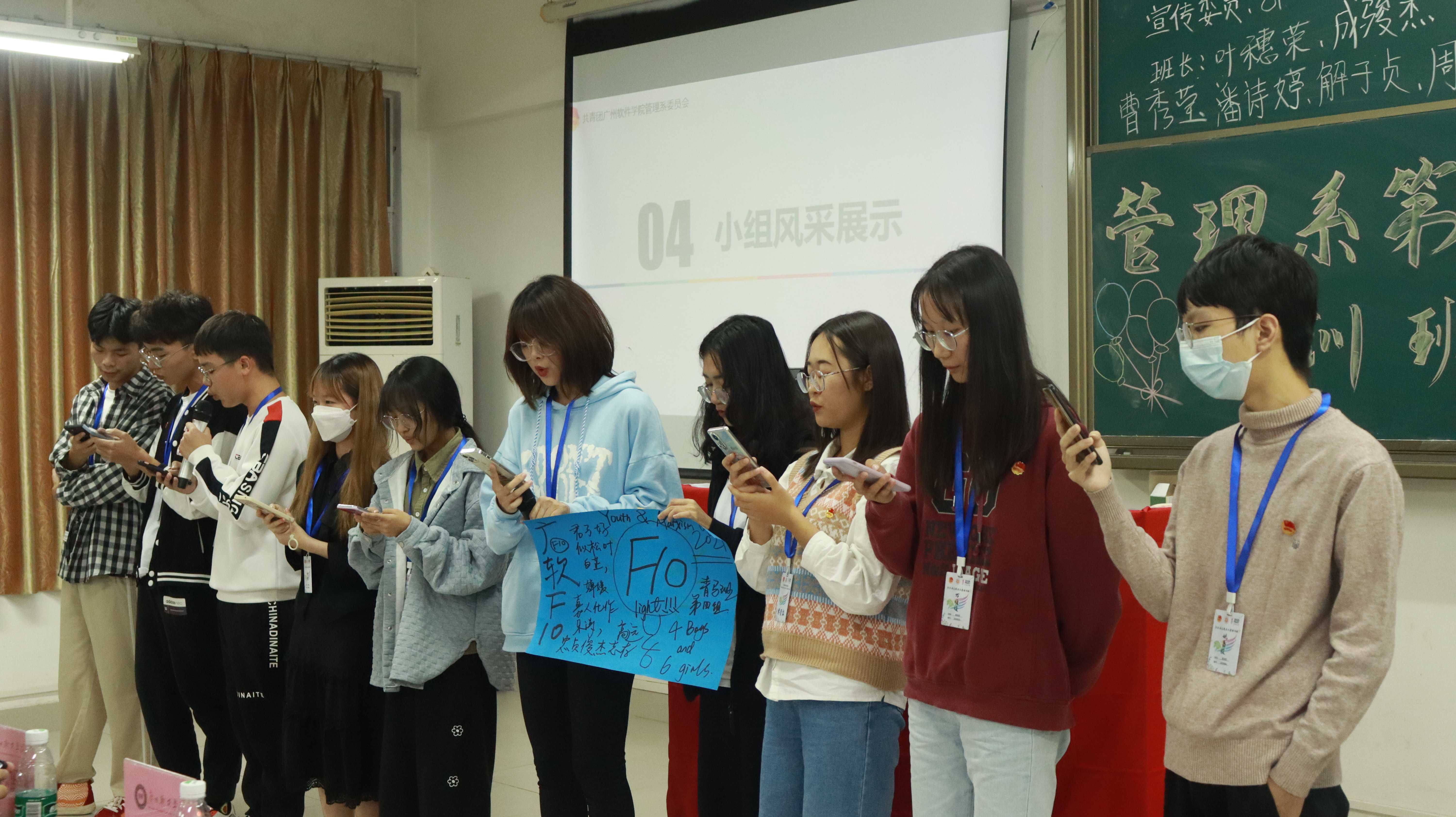 班委竞选结束后,进入会议的第三个议程:小组风采展示。在这个环节,各个小组将自己的组名和口号绘入卡纸中,学员们充满着朝气与活力,展现出新时代大学生的青春面貌。