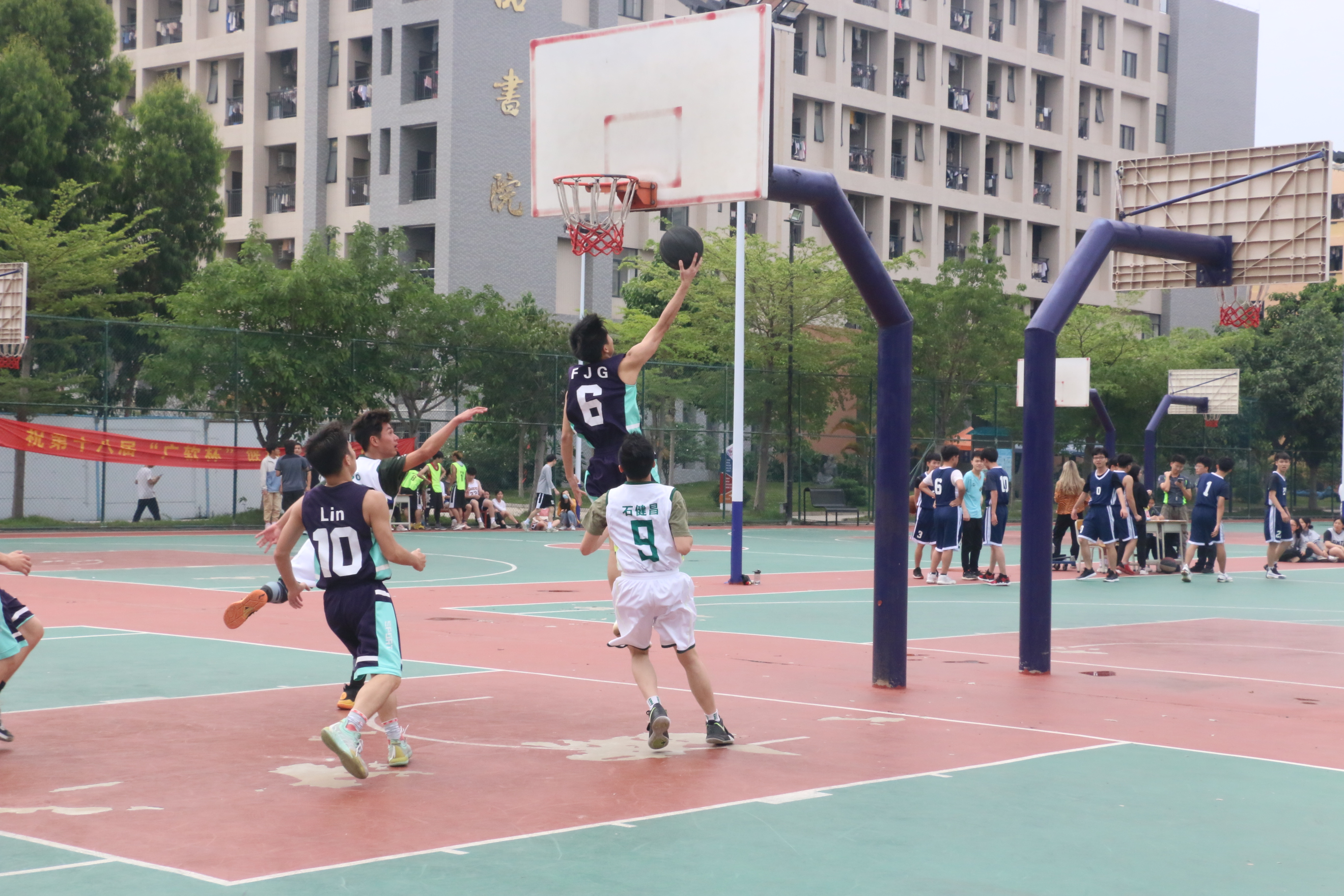 你一定要在篮球场上将球猛力地放进篮筐