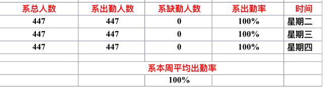 2015~2016学年管理系第十一周早读情况公示,大家第十一周早读全系无缺勤,请继续保持。加油加油!坚持坚持!