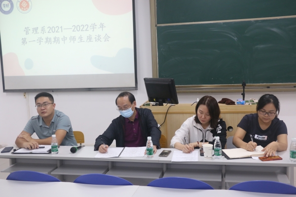 本网讯 为了解学生们近期的学习情况,解决学生在课堂中所遇到的问题,提高教学质量与水平,2021年11月2日下午13:00,管理系于T105召开2021——2022学年第一学期期中学生座谈会。出席本次会议的人员有:管理系主任张良卫教授、管理系副主任黄牧乾老师、管理系党总支张卫香书记、管理系团委书记兼学工办主任钟志坚老师以及管理系各班级学习委员和班级代表。
