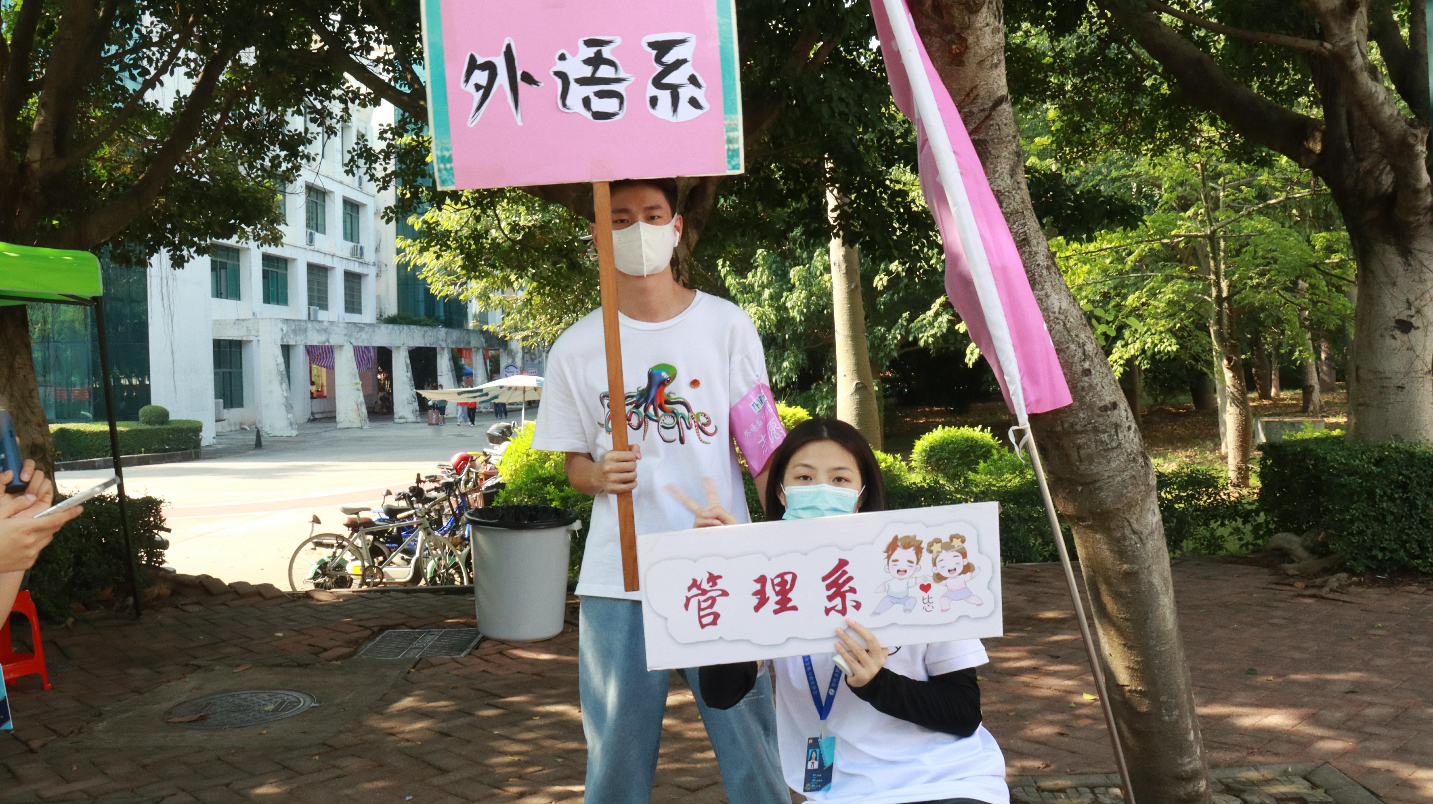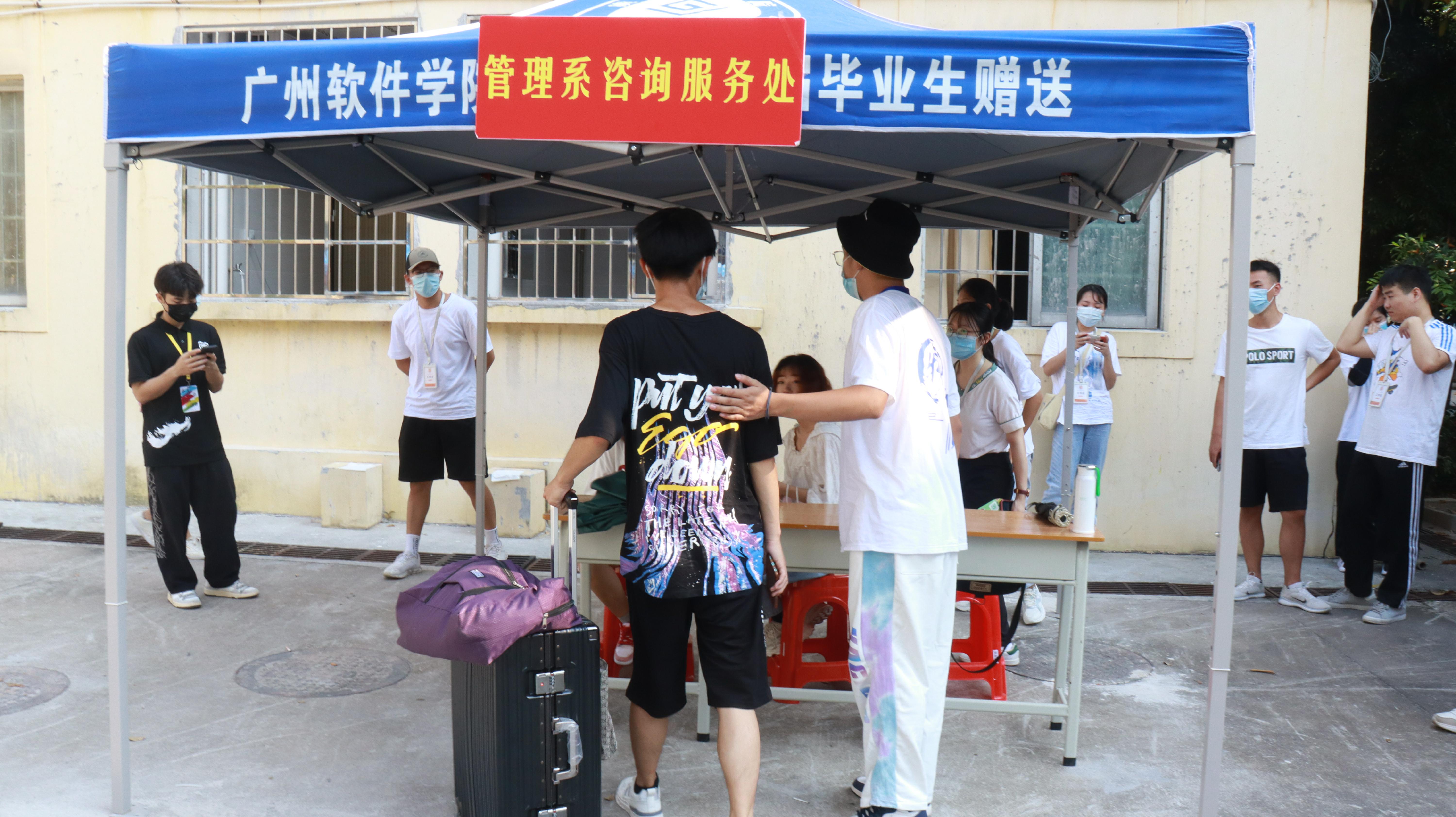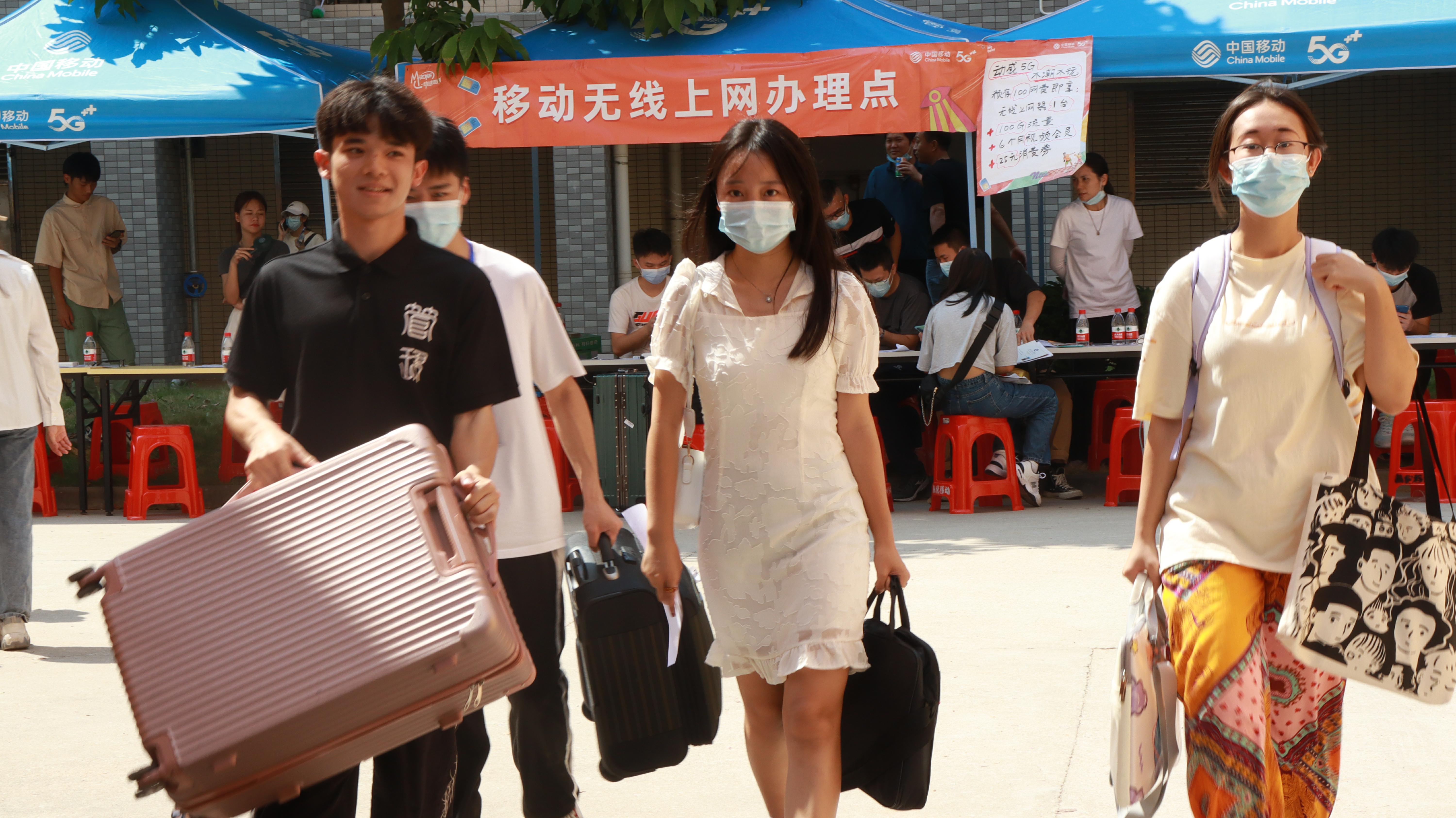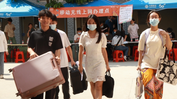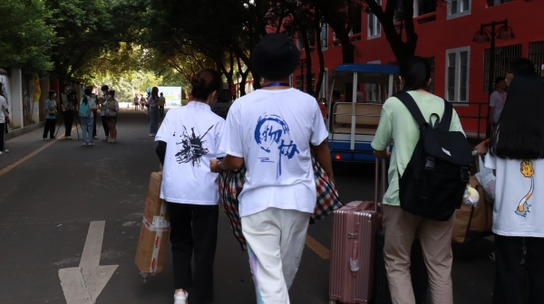 在宿舍区和校门迎新的工作人员