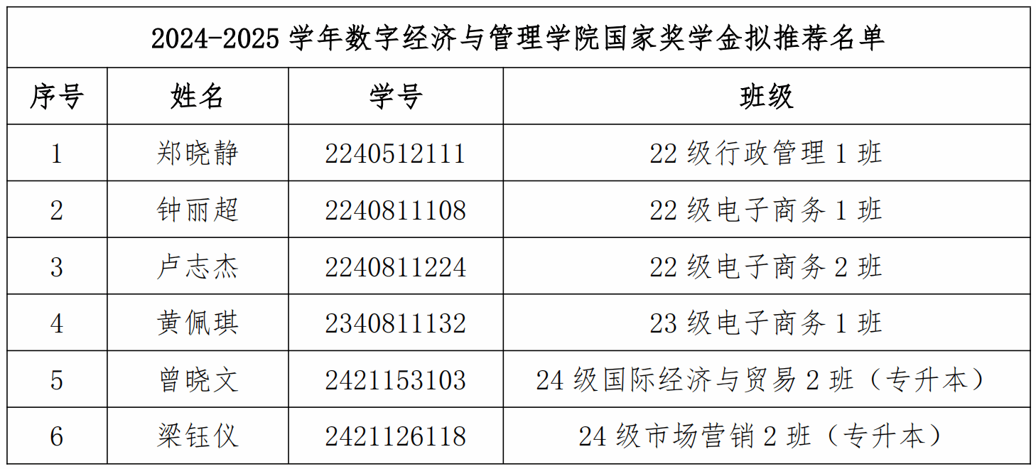 根据《关于2024-2025学国家奖学金评选工作的通知》要求和程序,我院严格遵循公平、公正、公开的评选原则,组织开展了数字经济与管理学院2024-2025学年国家奖学金评审工作。经学生个人申请、学院国家奖学金评审小组资料审核、学院公开答辩,报学院党政联席会议讨论研究,现拟推荐郑晓静等6名学习成绩优异,品行端正,社会实践、创新能力、综合素质等方面特别突出的同学参加2024-2025学年国家奖学金的评选。现将我院拟推荐名单予以公示三个工作日,如对推荐名单有异议,请在公示期间实名向学院反映,逾期不受理。公示名单如下: