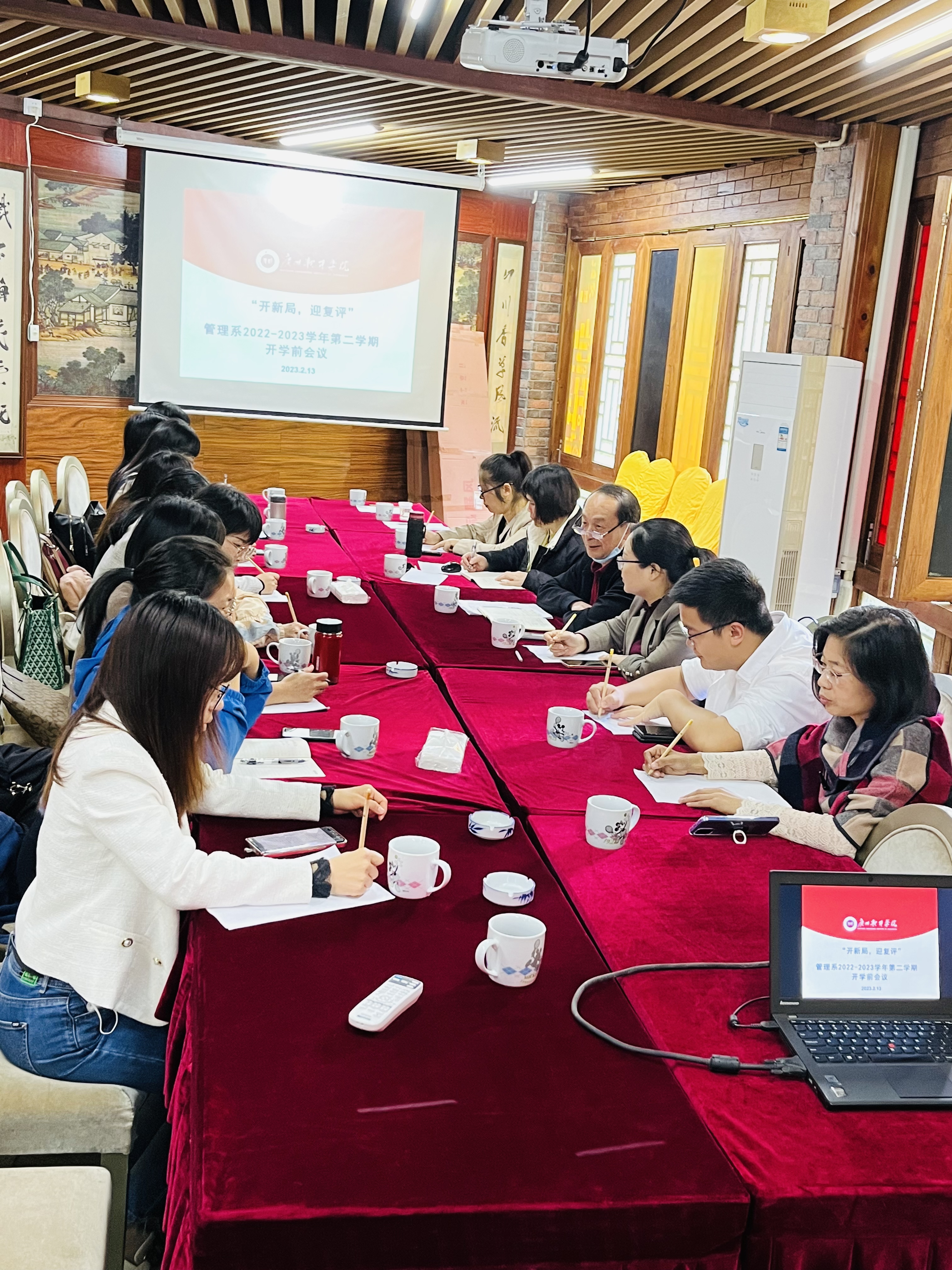 本网讯 管理系于2月13日召开2022—2023学年第二学期“开新局、迎复评”专业专业发展研讨会。系主任张良卫教授、副主任卢优兰副教授、党总支张卫香书记、各专业负责人和教研室主任以及教务员出席了会议。