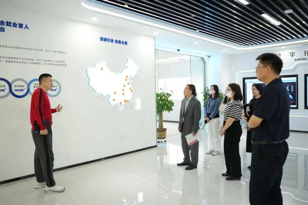 泰迪智能科技董事长张良均、产品中心总监周东平、运营中心总监翁梦婷、校企合作经理吴桂锋热情接待了我院代表一行。学院代表首先参观了企业展厅,详细了解了泰迪智能科技在人工智能、大数据等领域的创新成果。校企合作经理重点介绍了公司"产、岗、课、赛、证、文"六维一体的育人模式,该模式紧密对接产业需求,将岗位技能要求融入课程体系,通过组织竞赛提升学生实践能力,助力学生获取相关职业证书,并注重学术文化的全方位培养。