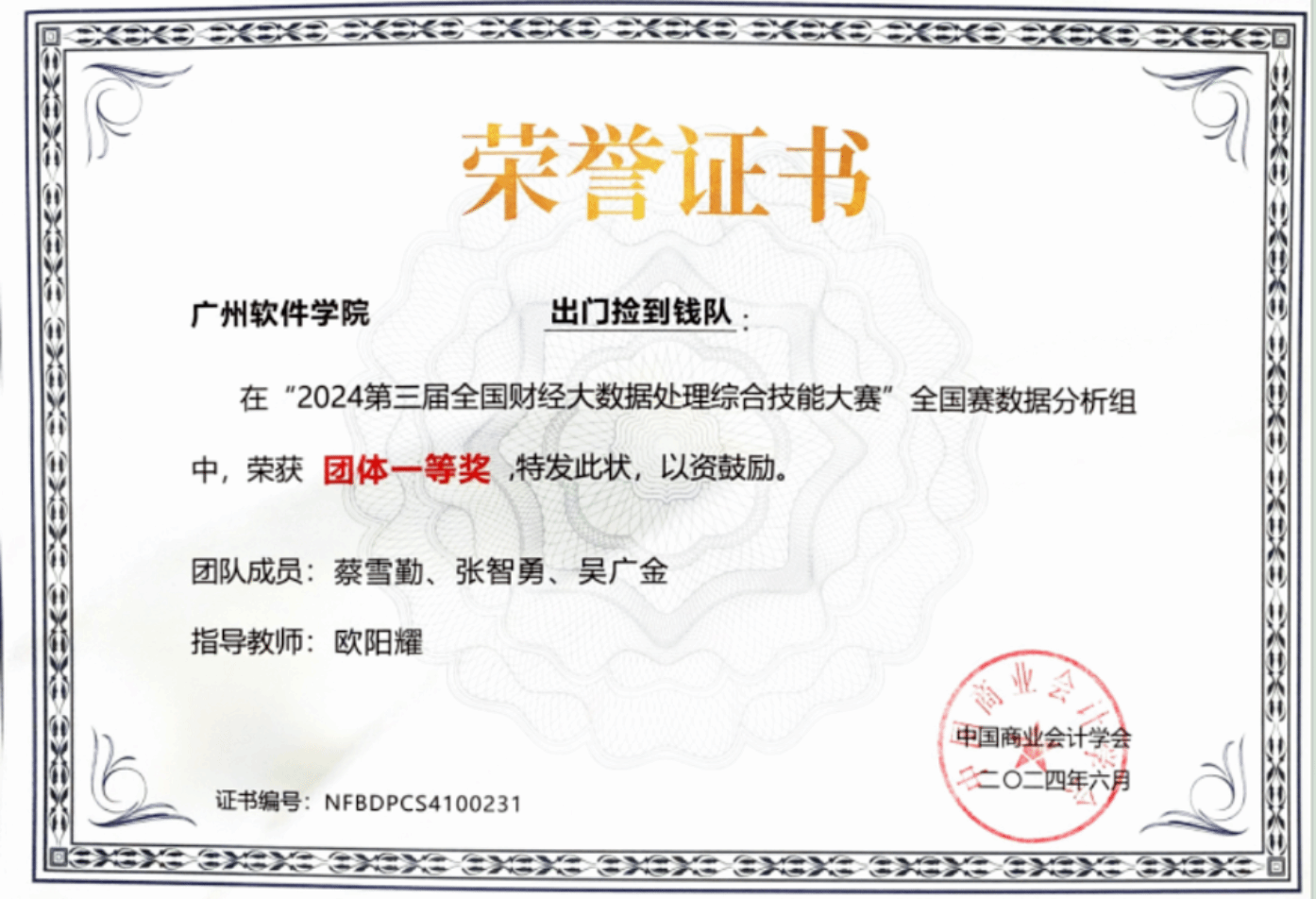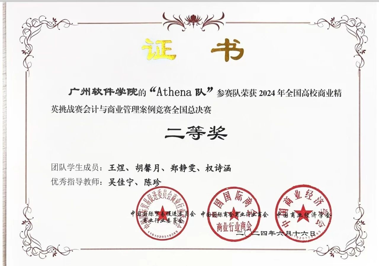 2024年5月获得广州软件学院2024年社团缤纷月“证因有你,得心应手”第九届初级会计大赛三等奖