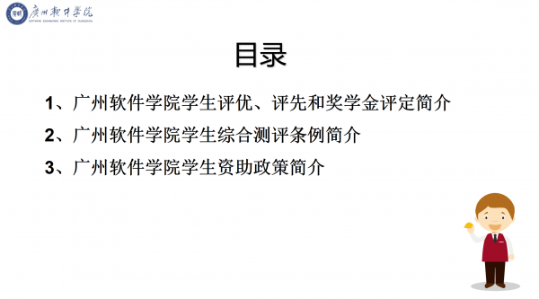 为了提高同学们对奖学金、助学金和助学贷款的认识,学院学生处李启沐老师分别从评优、评先和奖学金评定;综合测评条例和学生资助政策三个方面进行详细讲解,以求在未来能够更加有效协助新生处理问题。