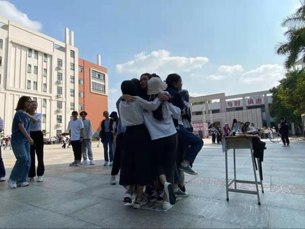 同舟共济,每个小组只有一张铺在地上的报纸。刚开始只能站3个人,随后依次加人,直至所有小组成员成功站上去并保持5秒即为成功。为了使全部人都站在报纸上,同学们真的是使出了浑身解数吖!