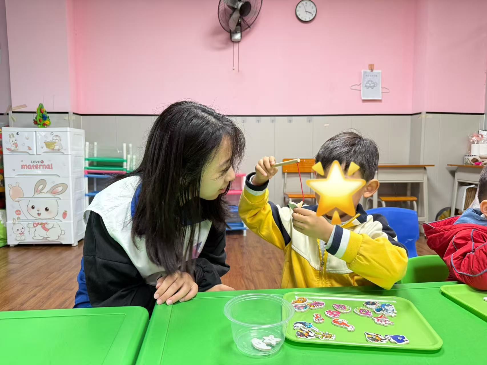 “天气冷啦,小鱼要穿新衣”,老师以这句童趣话语开启精细课。志愿者们紧密配合老师,时刻关注孩子们的状态并及时给予鼓励,与孩子们共同参与绳子缠绕鱼身、磁铁钓鱼、积木搭建等活动。这不仅有效提升了孩子们的专注力与手部精细动作能力,还让孩子们在实践中收获了成功的快乐。