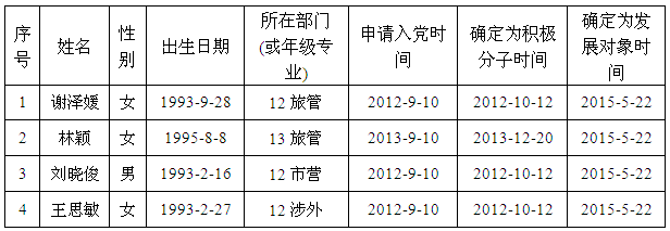 依照《中国共产党章程》和《中国共产党发展党员工作细则(试行)》的有关规定,通过本人申请以及党组织的培养和考察等程序,经管理系党总支研究,并上报系党总支和学院党委审批通过,拟吸收 谢泽媛 等4位同志为中共预备党员,现予以公示。