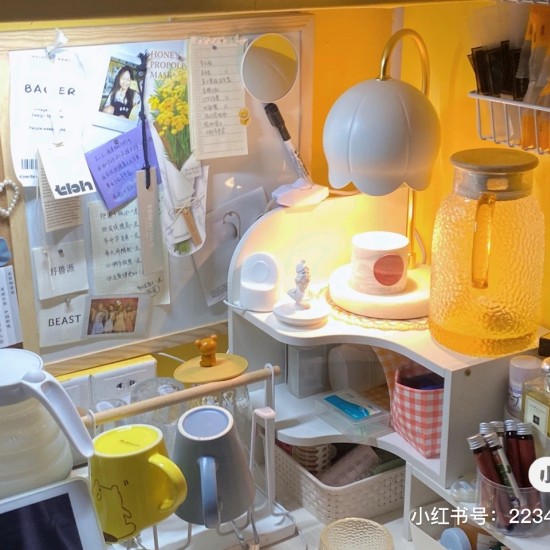 hello!我是个超级大懒猪,喜欢把常用的东西放在随手能拿到的地方,所以我将每周会用到的书籍物品放在下格,不常用的书籍物品放在高格,这样既节省空间又方便拿取。我的化妆刷和笔分别用买文具送的两个笔筒装,既简洁大方,又干净利落;悬空使用“酷毙灯”、兜篮等收纳工具,节约桌面空间;风筒和电脑不用时常放置在书柜顶端(小妙招!);高大物品统一放在高格靠右侧;兜篮里收纳了各种小物品,如口罩,药包,充电线,面膜,洗脸巾等。同时,我又有点强迫症,用桌面时不喜欢桌面有其他东西,所以桌面只有一个镜子和水壶啦!