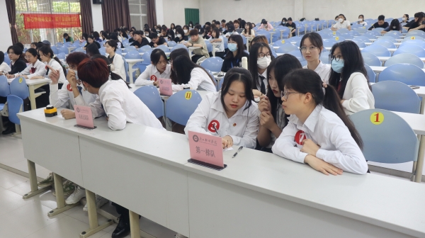 比赛正式开始,在第一个环节“党团同心,谱写新篇”中,八支队伍都分别选择一组题目进行作答,每组选手都经过认真思考后给出了他们的答案。现场气氛严肃紧张,但选手们依旧从容不迫,对答如流。