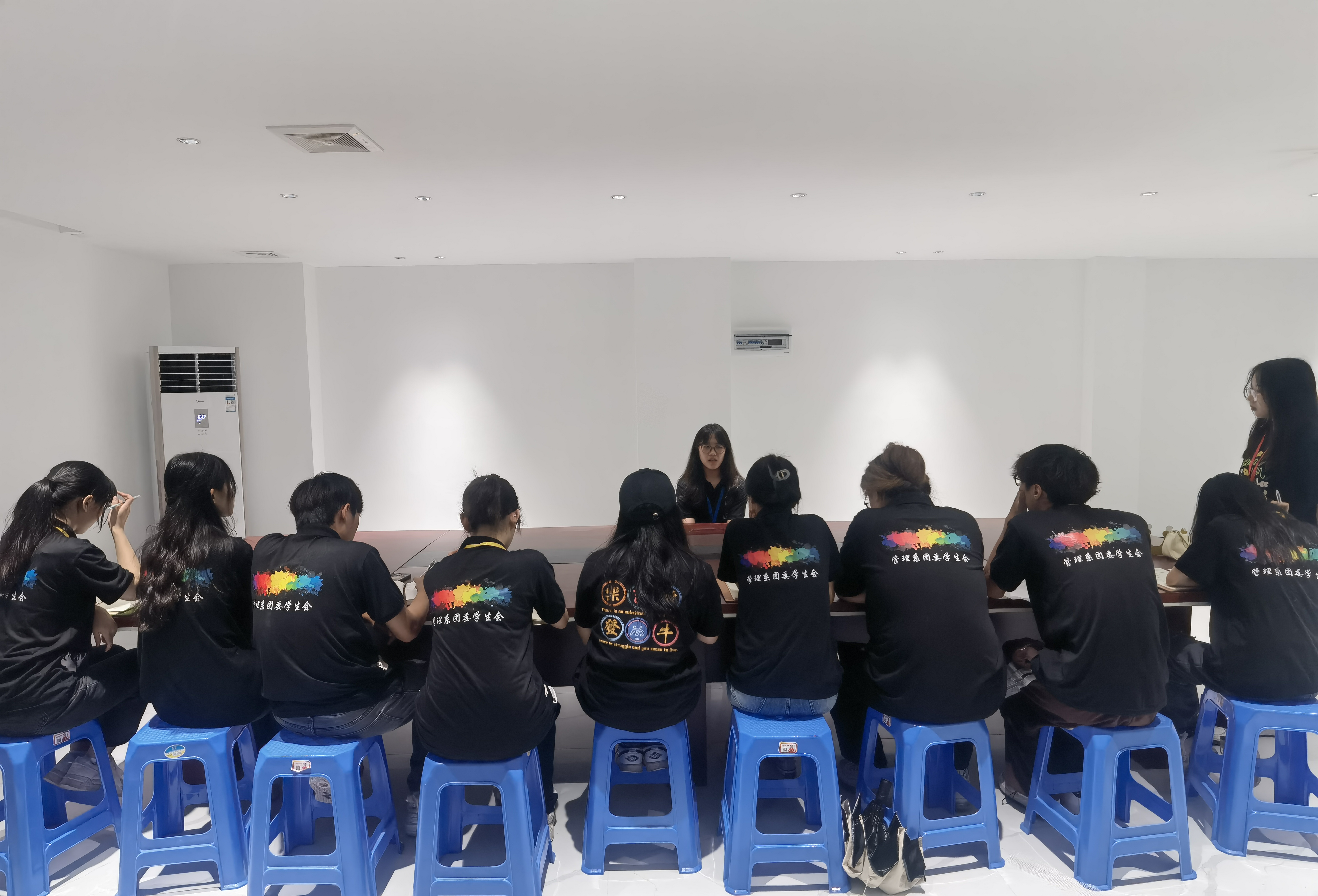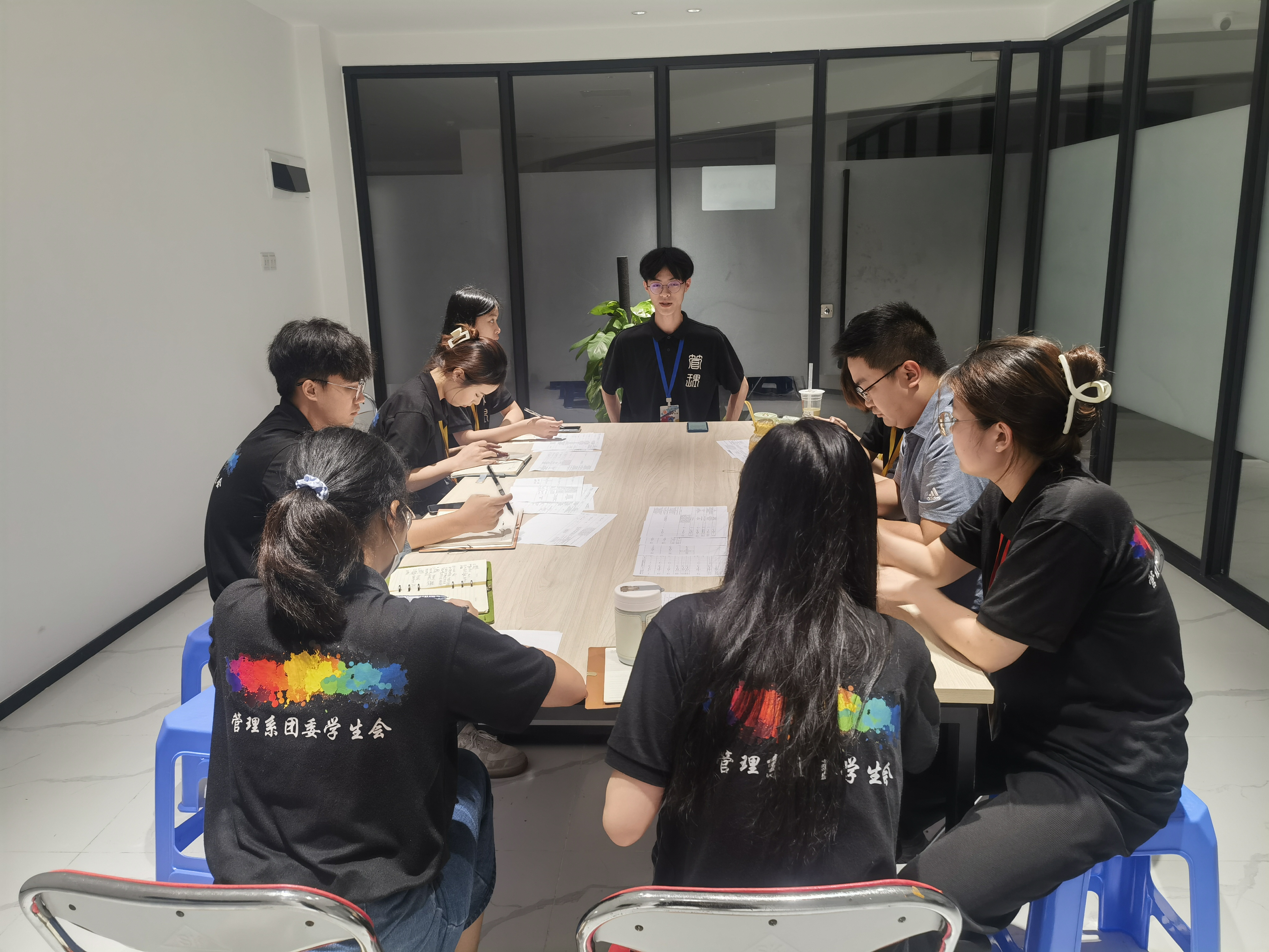本网讯 2023年6月4日晚上20:30,管理系团学于新行政楼209、210两个会议室举行第二十届团学学生骨干换届面试竞选。担任本次团学换届面试竞选的面试官有:管理系团委书记兼学工办主任钟志坚老师、管理系团委副书记兼学生会秘书长文姿懿老师、管理系团学大主席团全体成员与管理系团学各部门负责人。