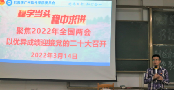 2022年3月18日,为了更好地学习2022全国两会,以优异的成绩迎接党的二十大召开,财经系党总支罗达书记开展了“聚焦2022年全国两会”学习授课,向广大青年群体介绍与讲解了2022年全国两会的详细政策方针,同时对青年群体寄予厚望。