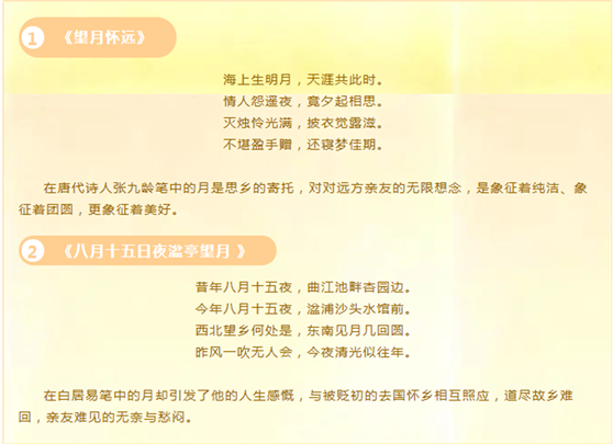 据说此夜月球距地球最近,月亮最圆最亮,所以从古至今都有饮宴赏月的习俗;民间中秋赏月活动的文字记载出现在魏晋时期,但未成习。到了唐代,中秋赏月颇为盛行,许多诗人的名篇中都有咏月的诗句。