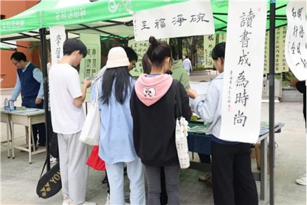 在活动现场,还有两个特色摊位吸引了众多读者,分别是图书馆读者协会在摊位上开展的“寻宝”图书馆活动以及书法协会在摊位上展示其会员的优秀书法作品。